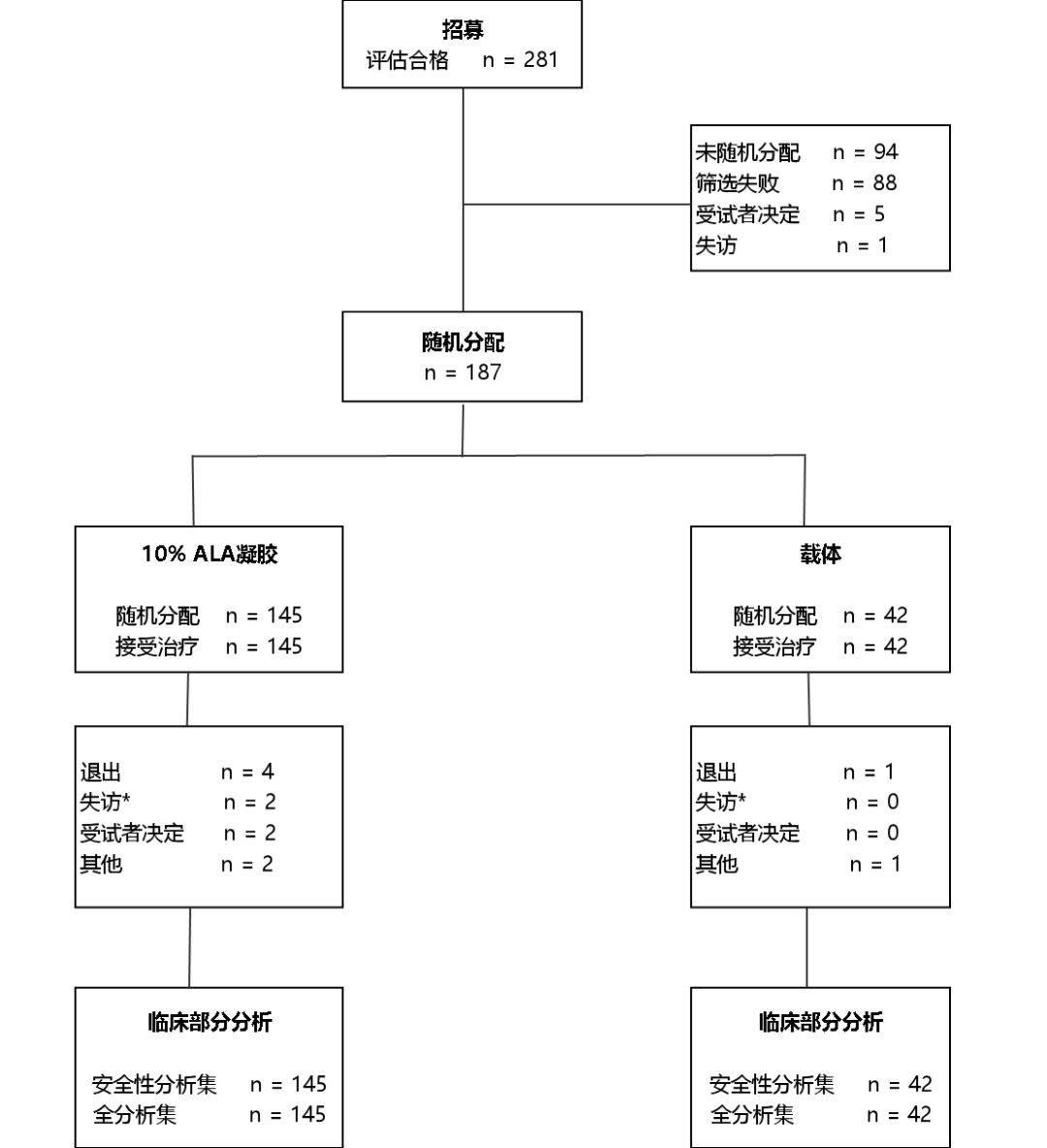 187例受试者中,145例接受10%ALA凝胶联合PDT治疗,42例接受载体联合PDT治疗。研究结果令人振奋: