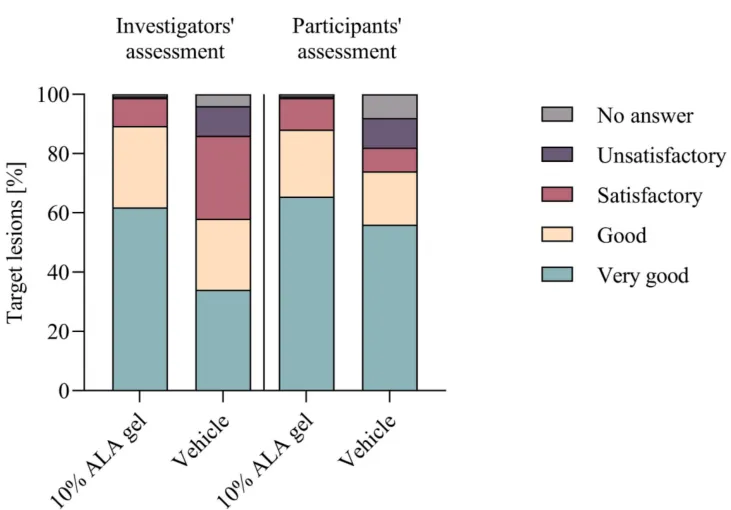 研究者评估:89.3%的ALA组病灶被评为"非常好"或"好"的美容效果