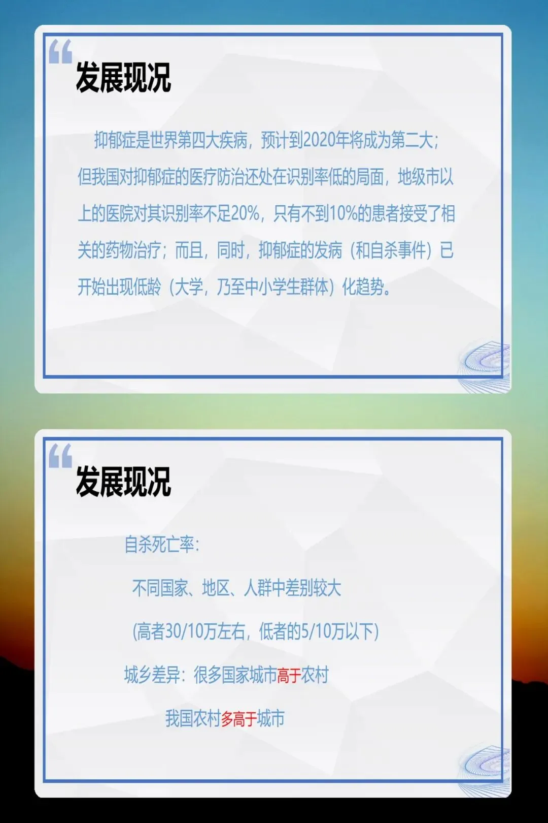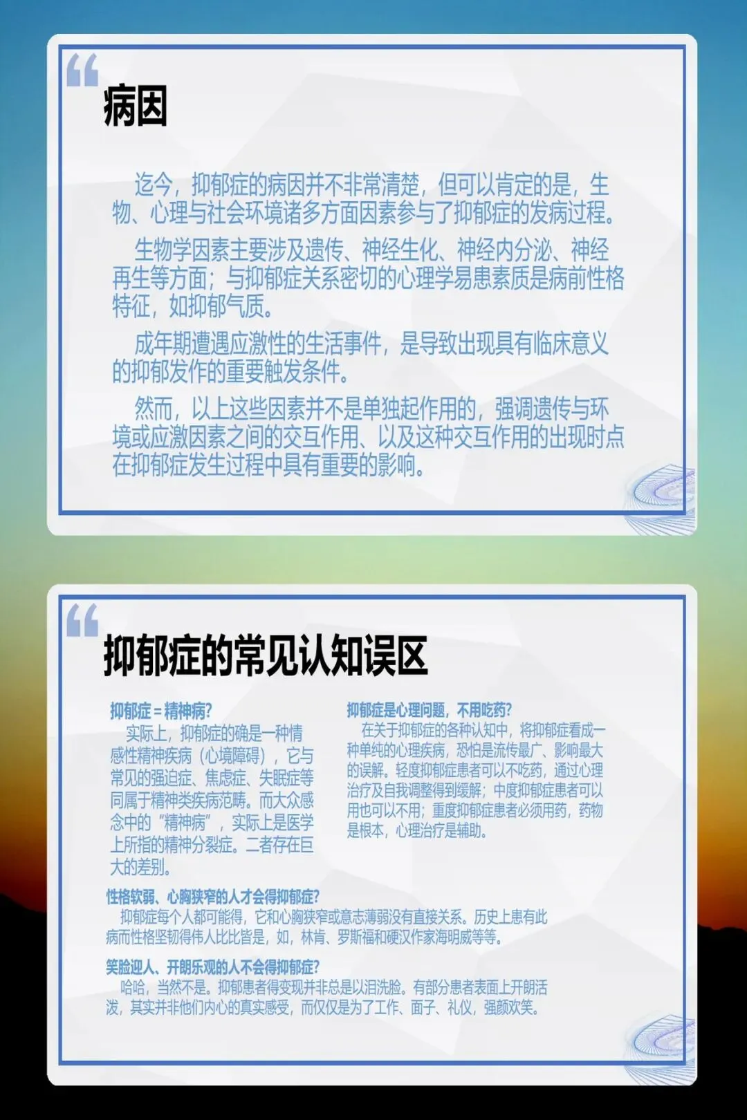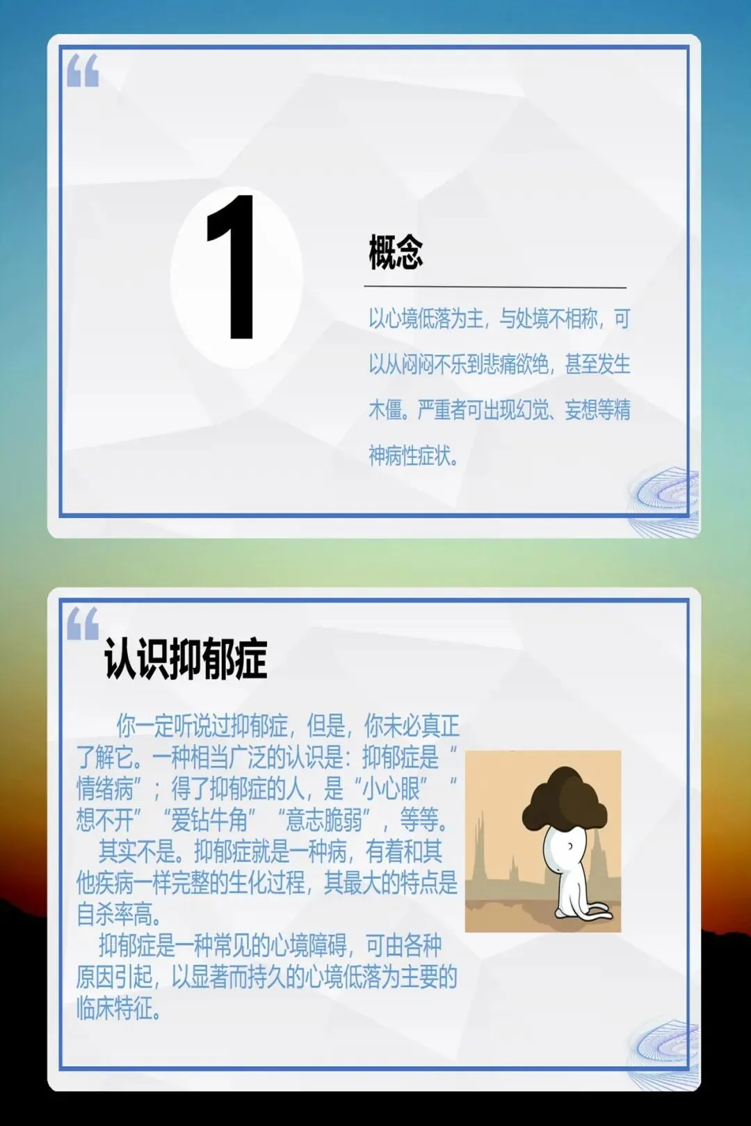- 抑郁症≠精神分裂症,它属于心境障碍,与大众理解的“精神病”不同。