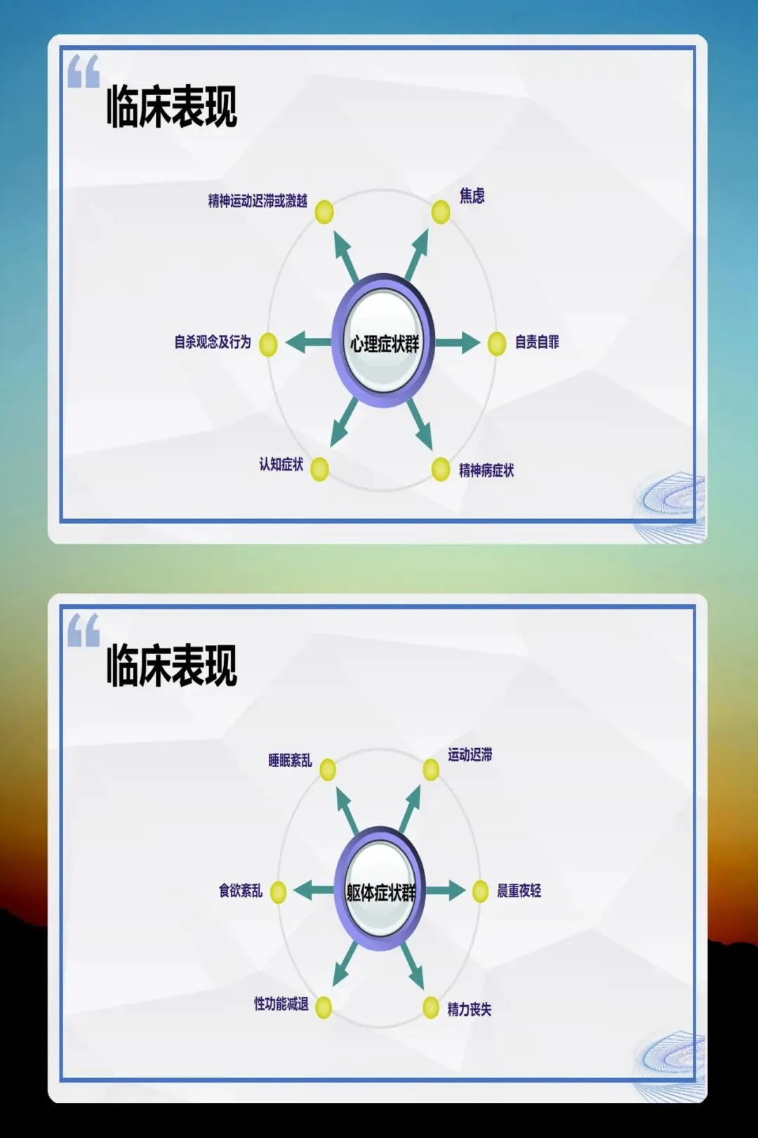分类包括:重性/轻性抑郁症、经前期心境恶劣障碍、季节性情感障碍(多见冬季,与日照减少有关)、双相I型(躁狂+抑郁)和双相II型(抑郁+轻躁狂)。