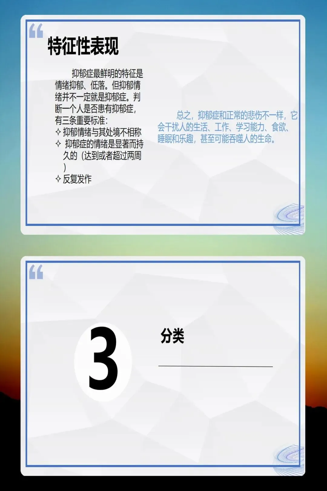 三大判断标准:抑郁情绪与处境不相称;症状显著且持久(≥2周);反复发作,干扰生活、工作及睡眠等。