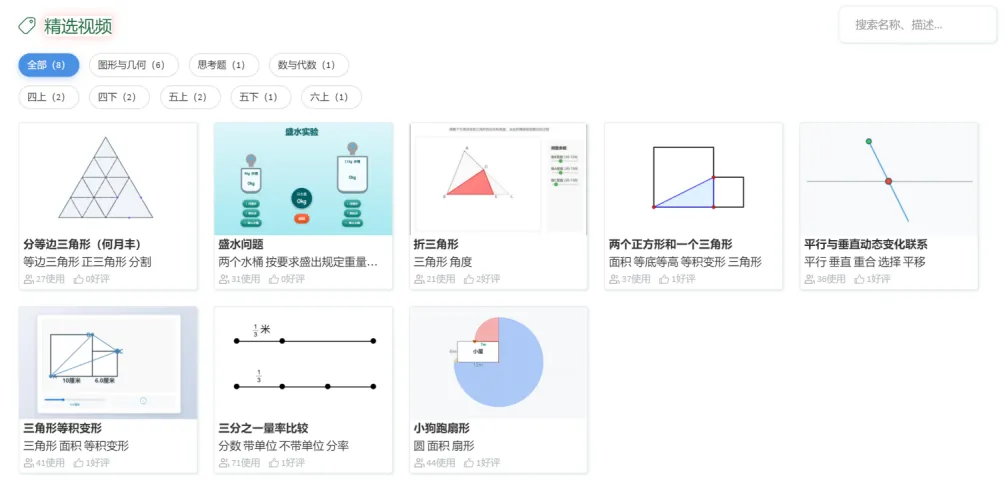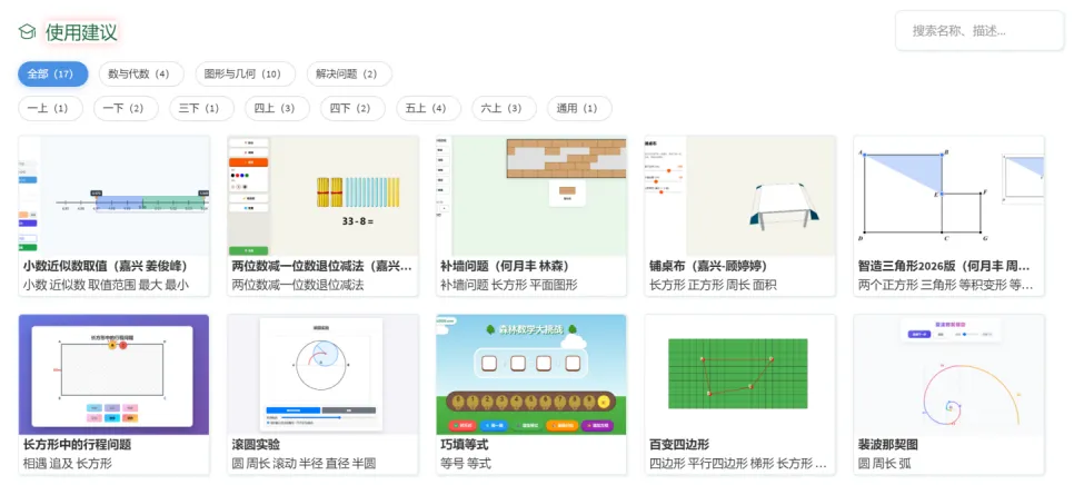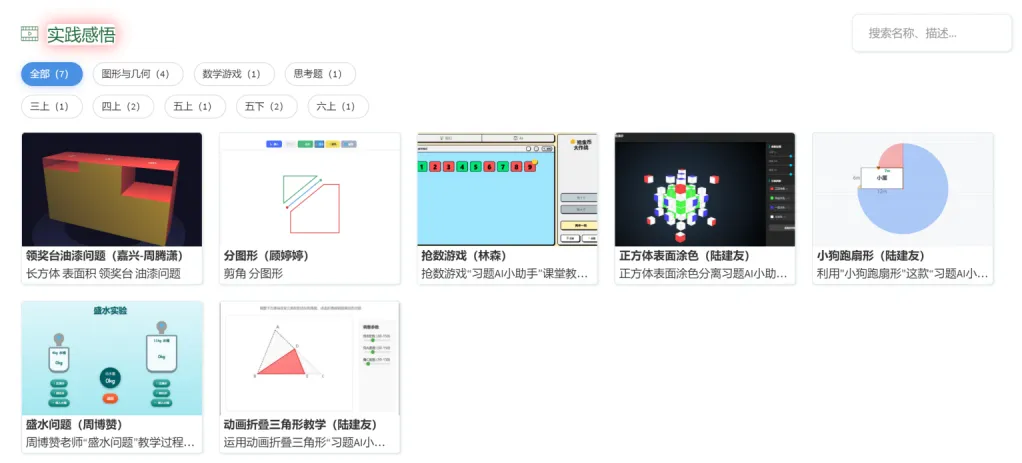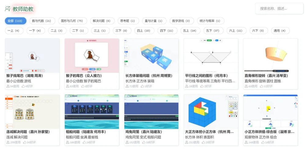 ◆教师助教:这个栏目中的内容,是一个个可供在线使用的“习题AI小助手”,点击即可打开。为了方便大家查找自己所需要的“习题AI小助手”,网站设置了按学期分类(一上→六下12个学期,因教科书版本不同以及版本修订,不一定精准,大致分类)和按内容分类(如图形与几何、数与代数等)两种查找方式。另,每一个“习题AI小助手”都根据其内容特点设置关键词,因此也可以通过页面右上角的“搜索”进行查找,比如输入“长方形”,与长方形有关的“习题AI小助手”都将会呈现。