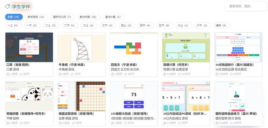 ◆学生学伴:这个栏目的内容本质上也是一个个“习题AI小助手”,是供学生练习用的,往往以游戏的形式设计。老师可以把链接推送给家长,在空余时可让学生玩一玩,在游戏中实现对某一数学知识的熟练和巩固。
