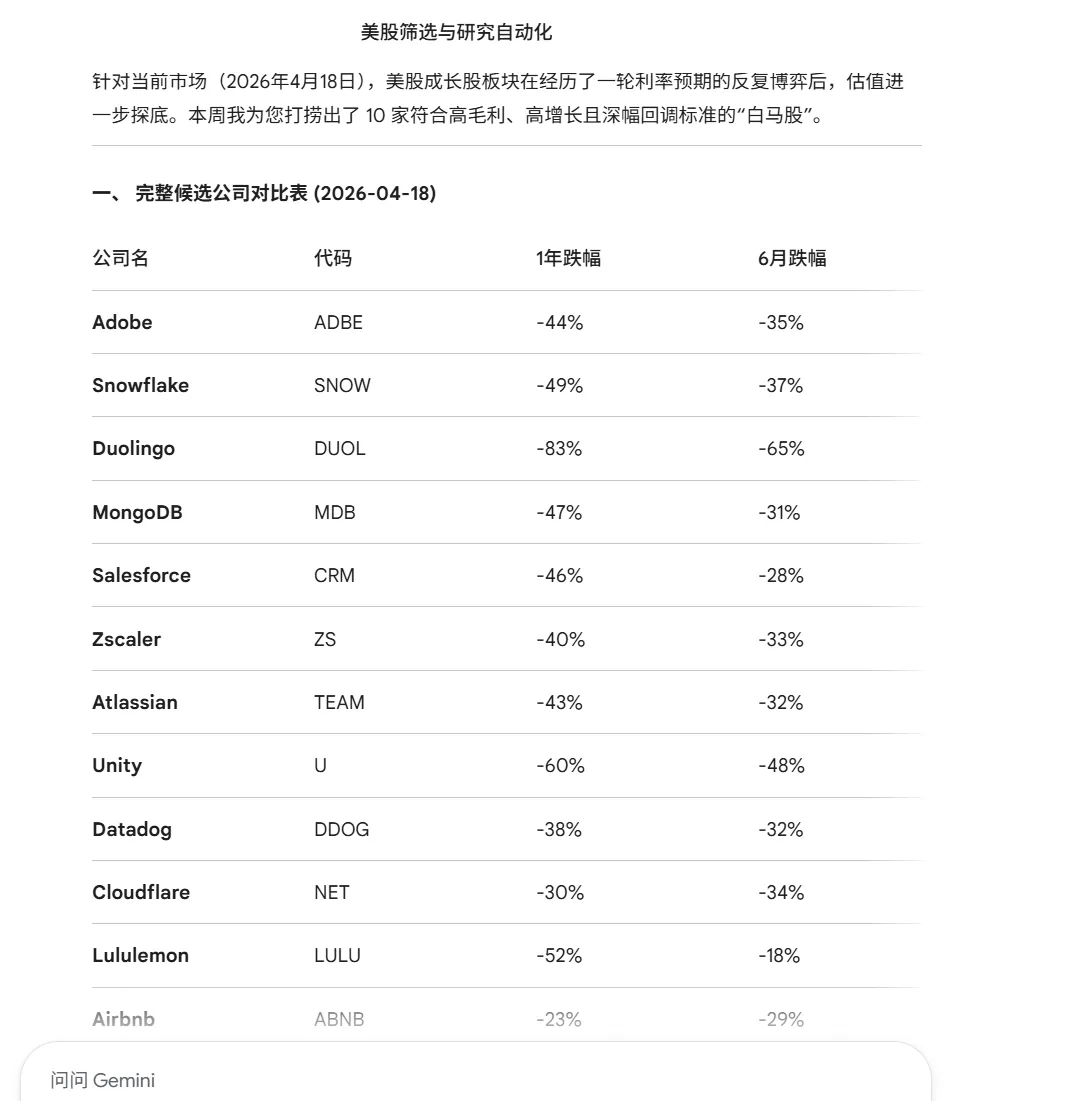 我除了ChatGPT有定时筛选处于股价低估公司的任务外,Gemini也同步上了一套用来对比,本周Gemini也给我跑了一遍全市场筛选,结果出来,和上周 ChatGPT 给的名单高度重合——Adobe、Snowflake、Duolingo、MongoDB、Salesforce……基本是同一批公司。