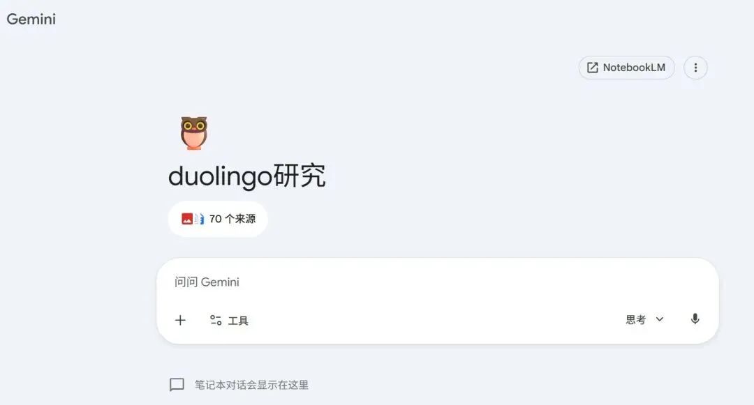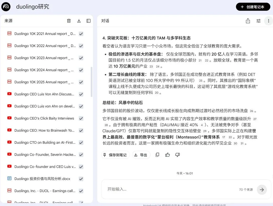 选定公司之后,我会在 NotebookLM 里专门建一个文件夹,命名就叫"duolingo研究"。NotebookLM是一套笔记本系统,AI会以笔记本里面存着的内容为基础进行研究,最大限度减少幻觉,所以,你喂给AI的资料质量高低就很重要。