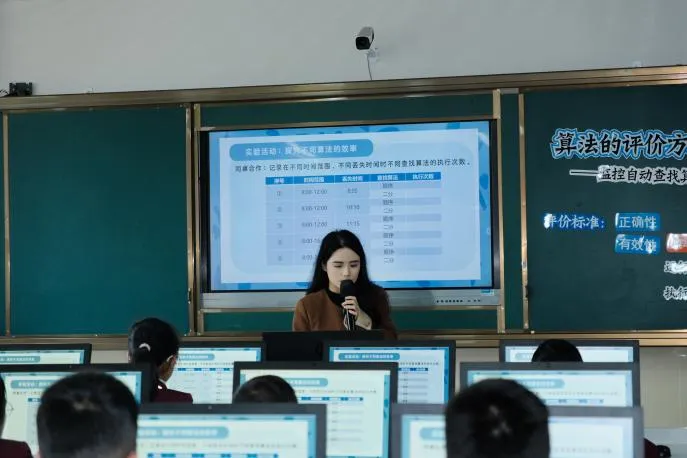 随后,由平阳县昆阳镇新城小学的郑唐怡轩老师执教《算法的评价方式》。郑老师以“校园失物招领”为情境,引导学生化身“算法设计师”,对比两种监控查找算法——顺序查找与二分查找。让学生通过观察、分析、实验等方式,学习从“正确性”和“有效性”两个维度评价算法优劣,引导学生借助流程图设计添加计数变量的算法,并记录查找次数,验证二分查找在大多数情况下效率更高,但也发现当目标靠前时顺序查找更快。最后,学生将评价方法迁移到外卖路线规划等真实问题中,初步建立根据实际需求选择合适算法的意识。整节课注重动手实践与数据分析,培养学生的计算思维和科学评价能力。