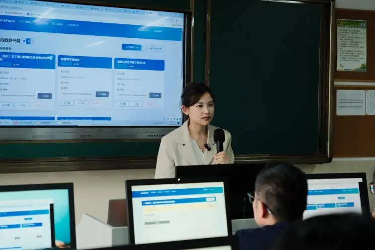 下午,来自平阳县昆阳镇第二小学的吴宁静老师以《从“快”出发,向“新”而行”》为主题,分享QuickForm工具在三年级信息科技教学中的应用。她介绍了工具零编程、数据实时同步等优势与极简操作五步法,结合课前调研、课中测评、课后分层作业等场景,对接新课标核心素养,通过实操互动助力教师高效开展精准教学。