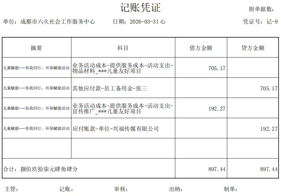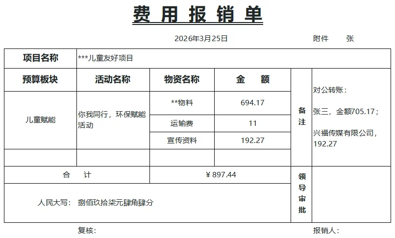 为开展“你我同行,环保赋能活动”(属于XX社区儿童友好项目中的“儿童赋能”预算板块),发生活动费用共计897.44元,其中包含物料费694.17元、运输费11元、宣传资料费192.27元。上述款项暂未支付。