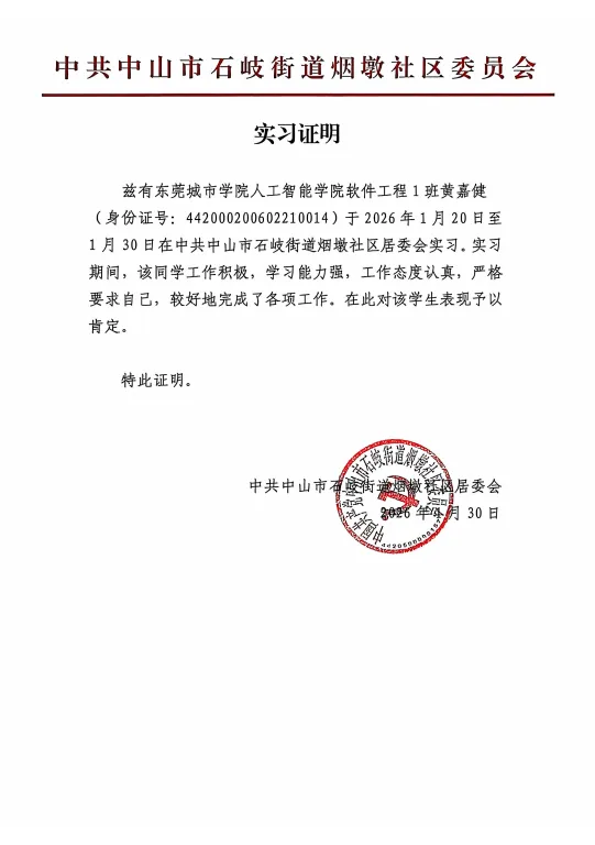 受中山市老年津贴认证政策改革部署,黄嘉健在返家乡社会实践中,负责烟墩社区(由6个社区合并)老年津贴资格认证电话通知工作,覆盖符合条件老人3000名。