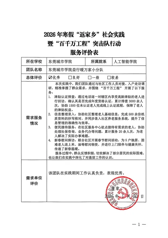 2026年1月20日—2026年1月30日期间,圆满完成各项社区志愿服务任务,各团队成员累计服务时长超 70小时,获得社区官方认可,彰显实践的真实性与价值。