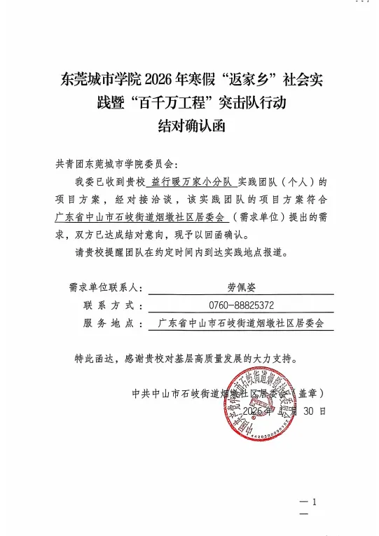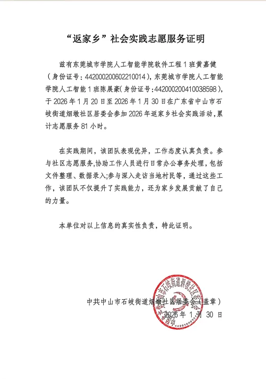 我院2026年寒假“返家乡”社会实践工作圆满完成,多支队伍获评校级优秀团队。本推文我们走近由黄嘉健、陈展豪两人组成的团队。他们凭借各自独特的优势与丰富经验,凝聚成一支实力强劲的实践团队,致力于服务家乡社区发展,展现了东莞城市学院学子勇于担当、乐于奉献的青春风貌。