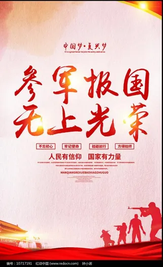 青春逢盛世,奋斗正当时。参军报国,不仅是对家国的责任担当,更是对自我的磨砺与成长。在这里,你将练就钢铁意志,收获战友情谊,让青春在守护家国的征程中绽放光芒。此刻,征兵的号角已响,愿你怀揣赤子之心,奔赴军营,用热血与汗水书写属于自己的强军篇章。