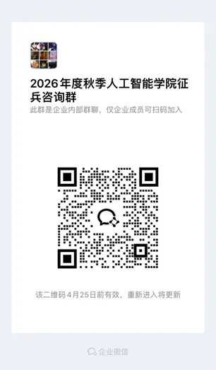 心怀家国,向往军营的同学们,学校2026年度秋季人工智能学院征兵咨询群已建立,扫描下方二维码加入,即可获取最新征兵动态、政策解读,解答报名、体检等疑问,与志同道合的伙伴共赴戎装之约。