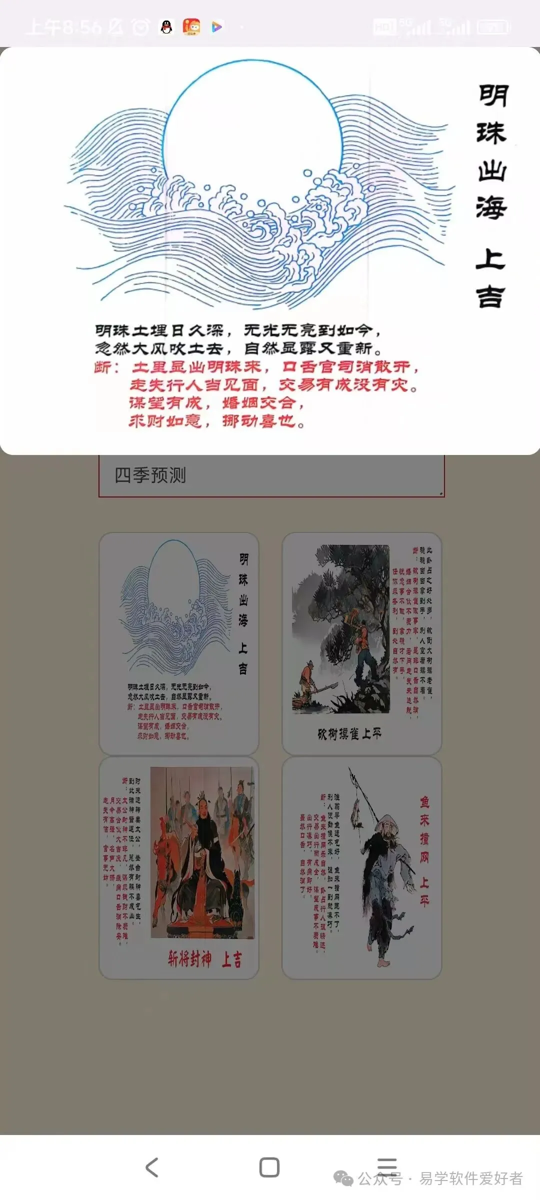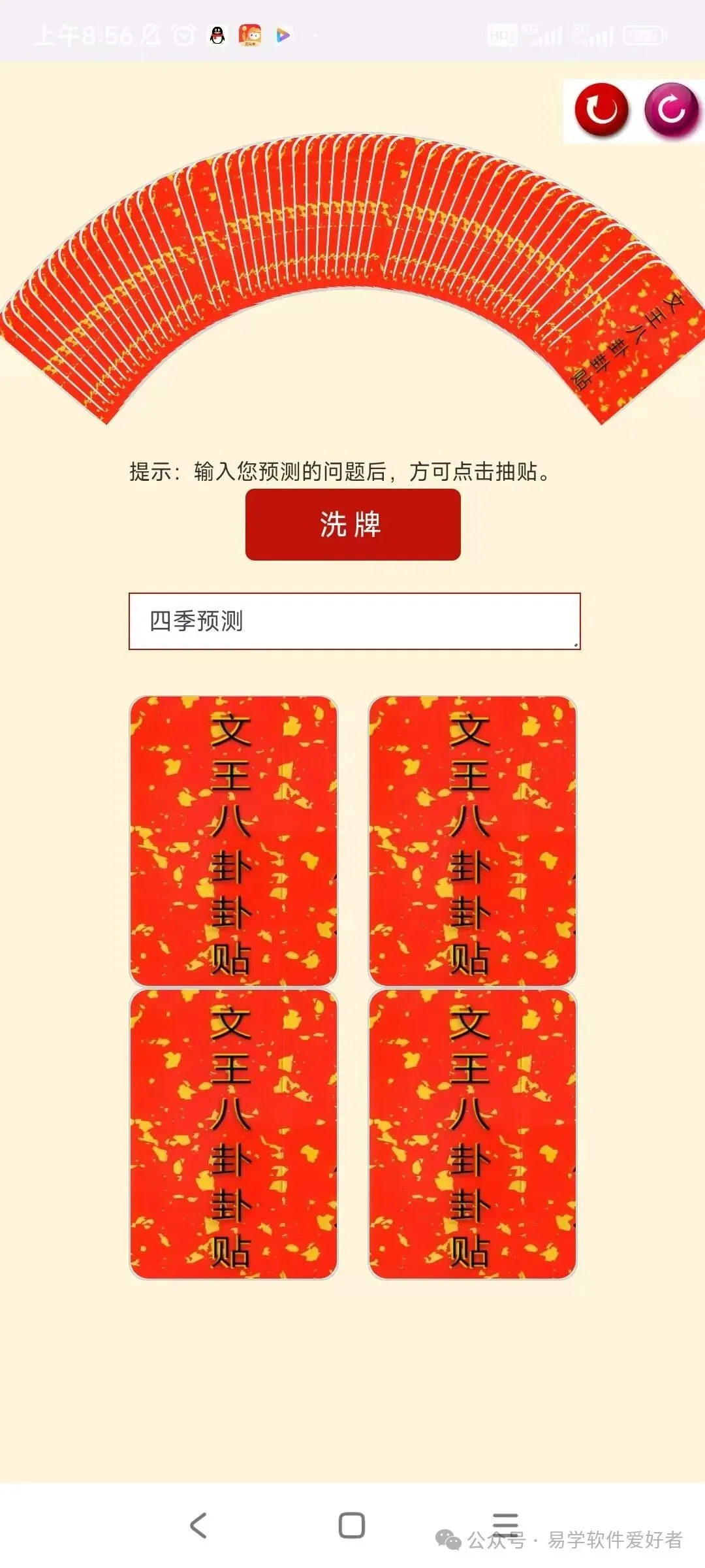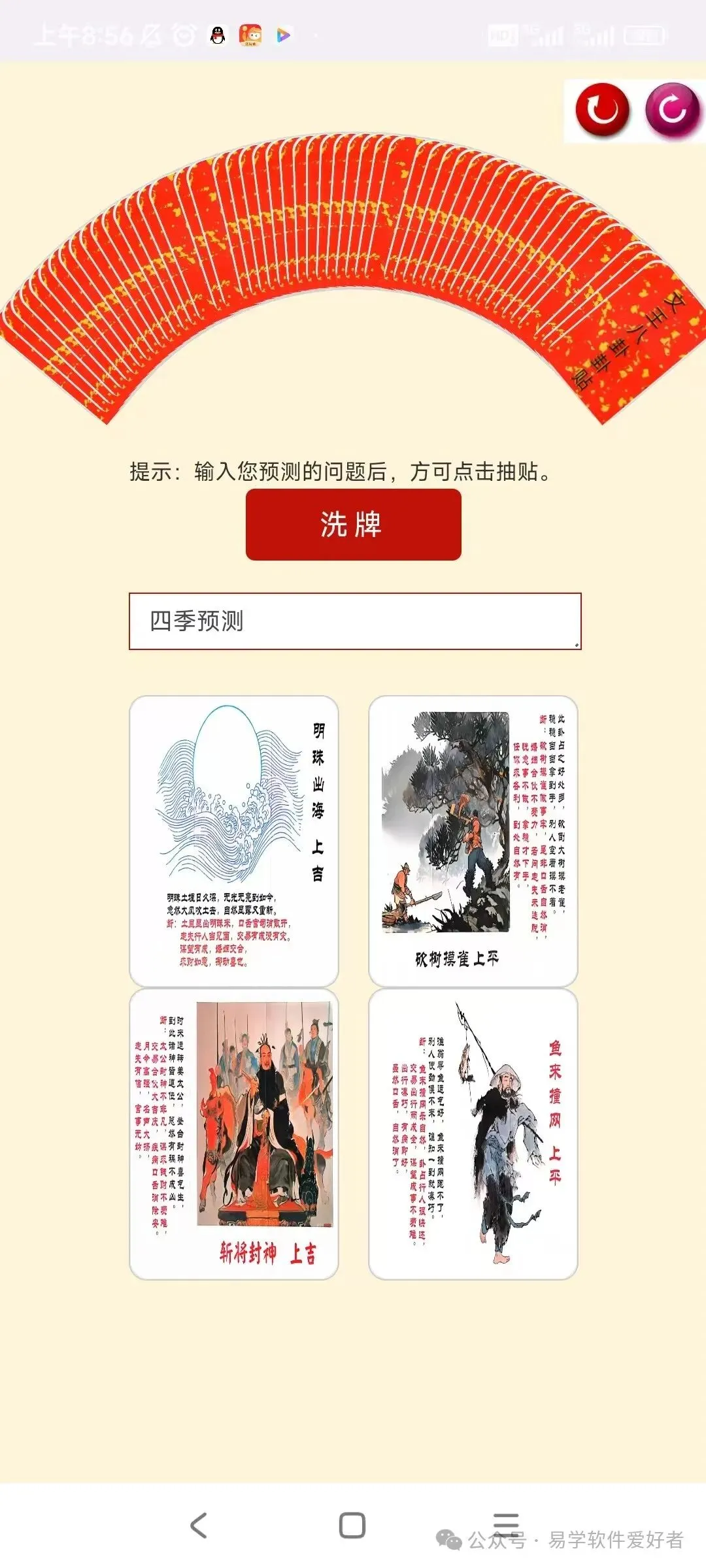 软件通过抽牌的形式进行预测,先从卦贴中抽四张,再从四张抽一张,根据显示卦贴内容得出结果。