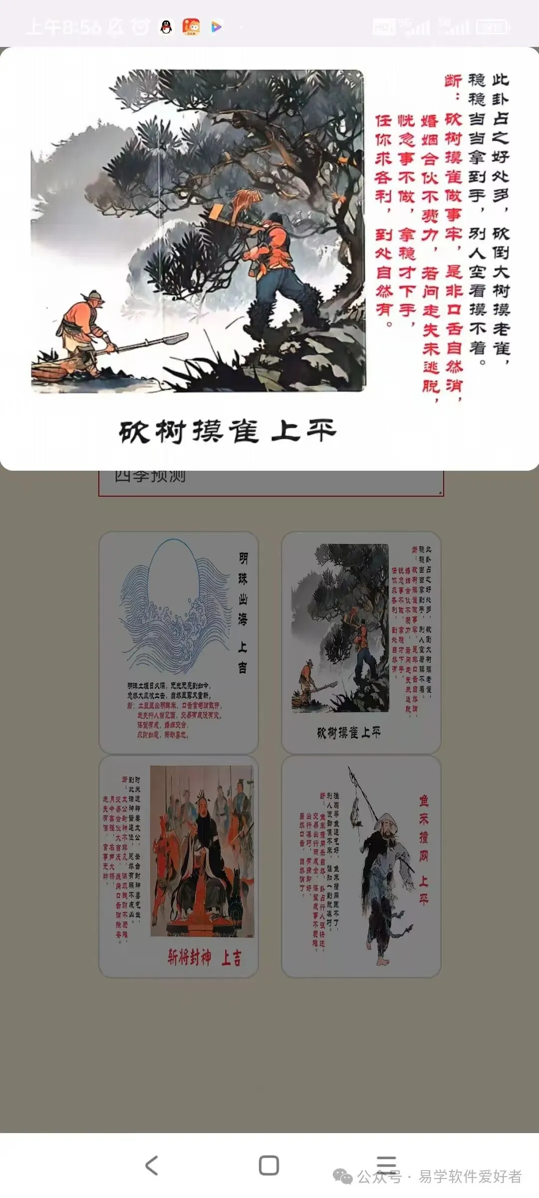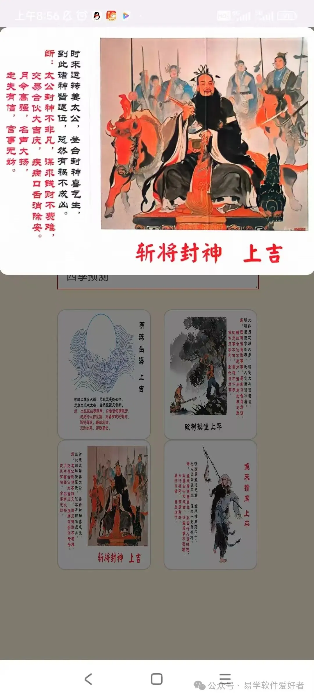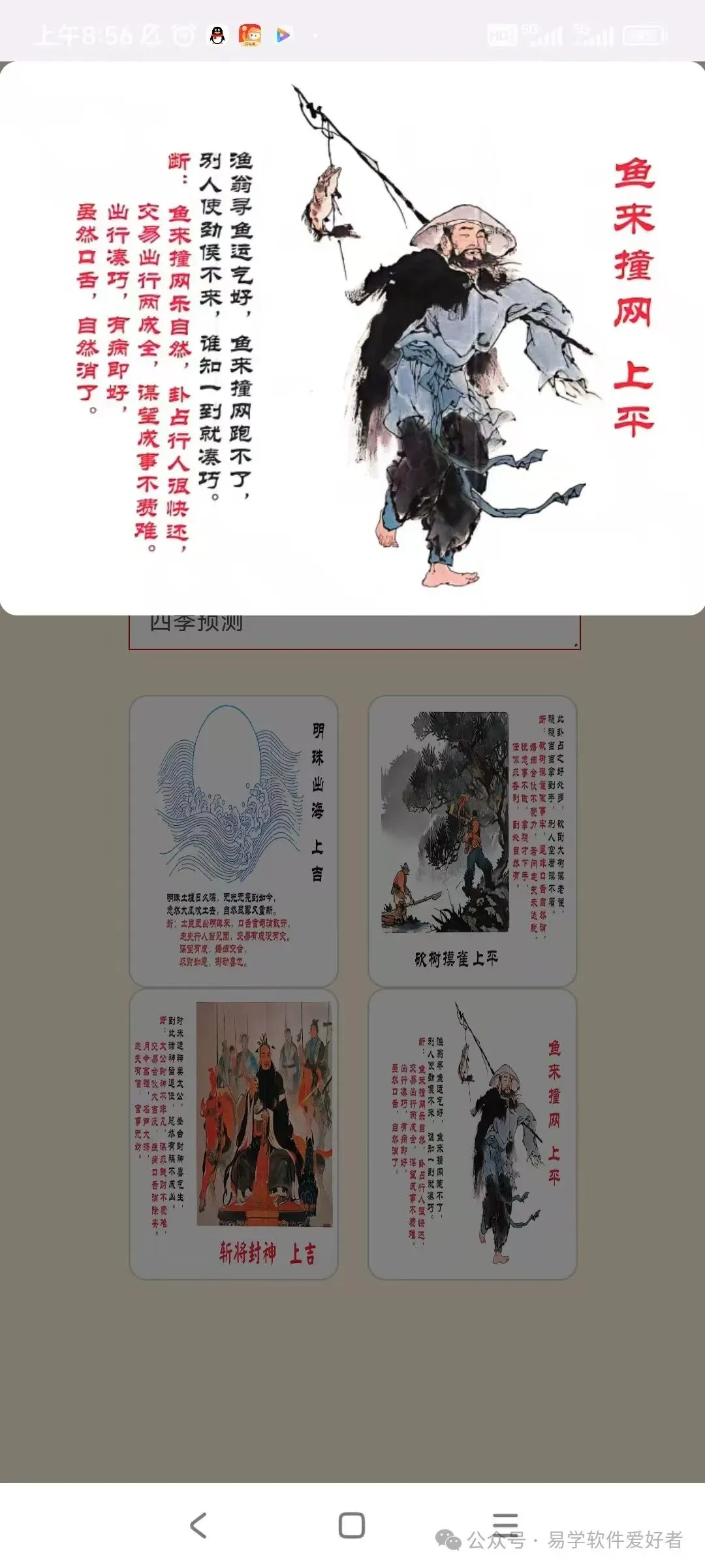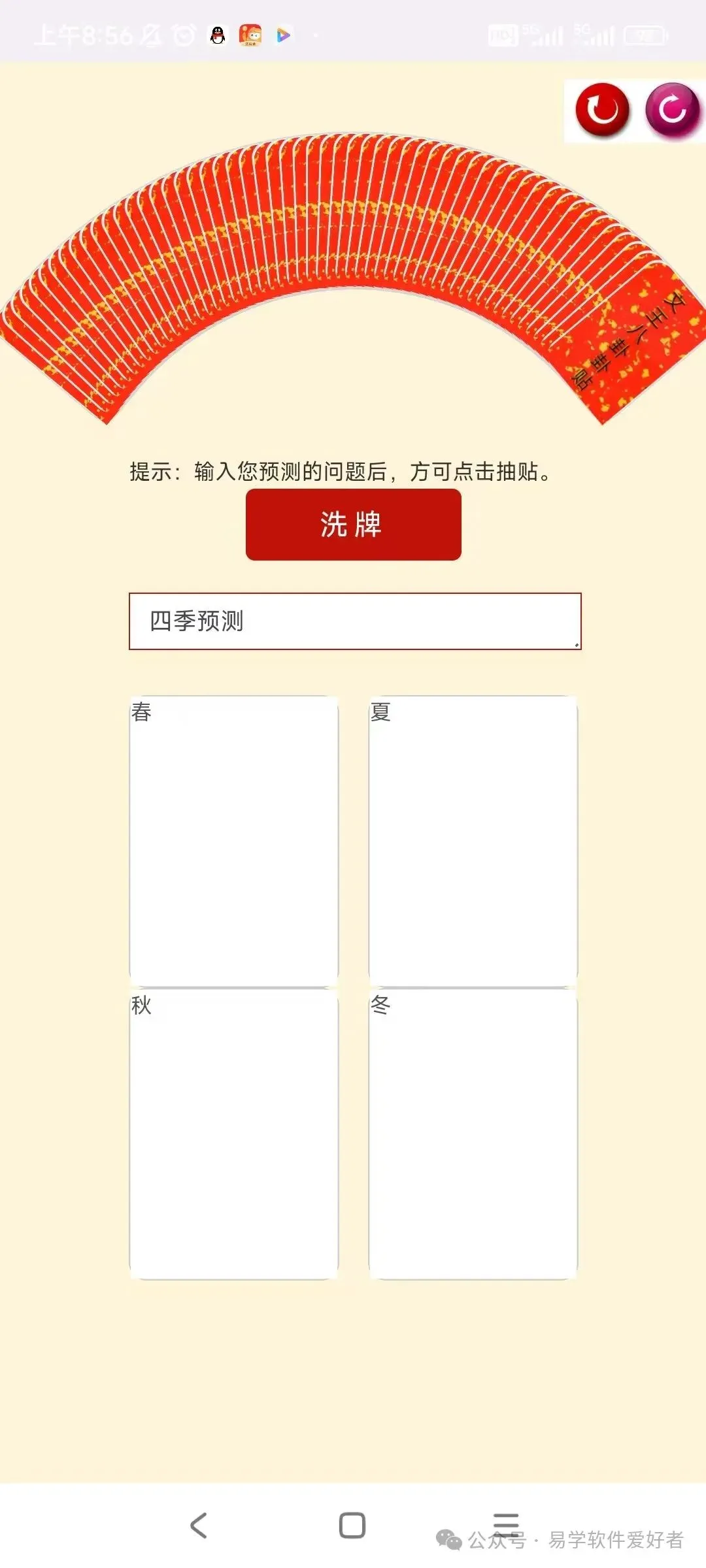 软件通过抽牌的形式进行预测,先从卦贴中抽四张,再从四张抽一张,根据显示卦贴内容得出结果。