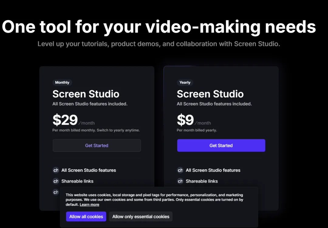 后来被一个朋友安利了一款付费工具叫Screen Studio,功能是真香,录完自动处理缩放和标注,导出来效果也很精致。但价格嘛——每月29美元,一年两千多。肉在疼,心在滴血。