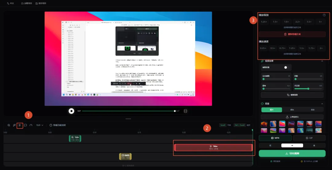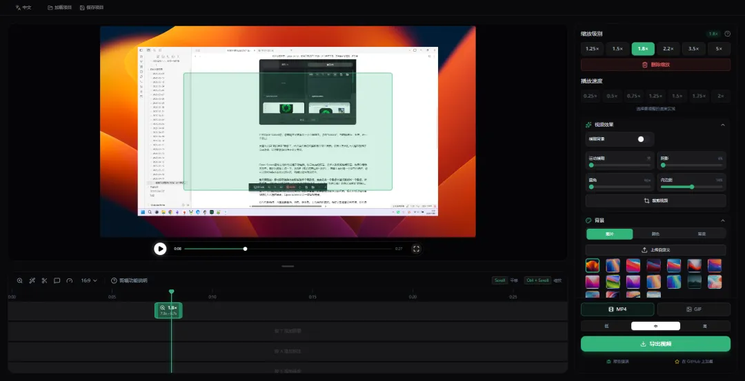 Open Screen最核心的能力就是手动缩放。你录制完视频后,会进入到视频剪辑界面,如果你想放大哪里,就在时间轴上点一下,按Z键(或者点旁边的+按钮),屏幕上会出现一个绿色的框框,你可以拖动框框选要放大的区域,右侧还能调缩放倍率。