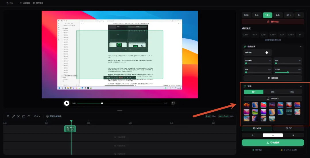 它有几种选项:内置抽象壁纸、纯色、渐变色、上传自己的图片。选好之后背景立刻替换,你的录屏内容还在,但背景已经变成你所选择的内容了。