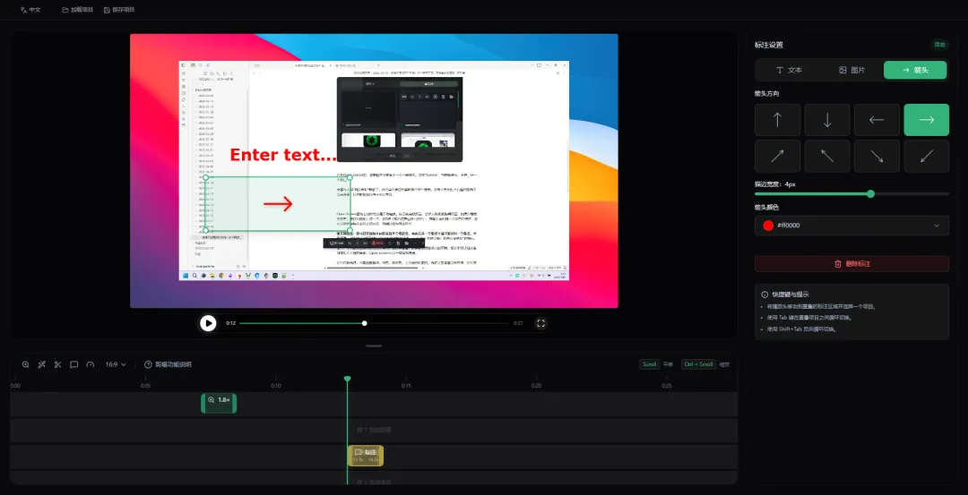 如果你的内容有需要在视频中添加文字说明或者指向某个按钮?那么你点工具栏里的A(文字)或箭头按钮,直接拖到画面上就能加。还能插入图片(比如公司Logo)。