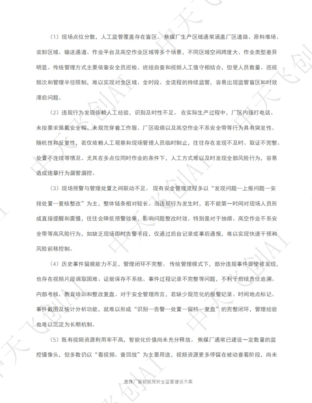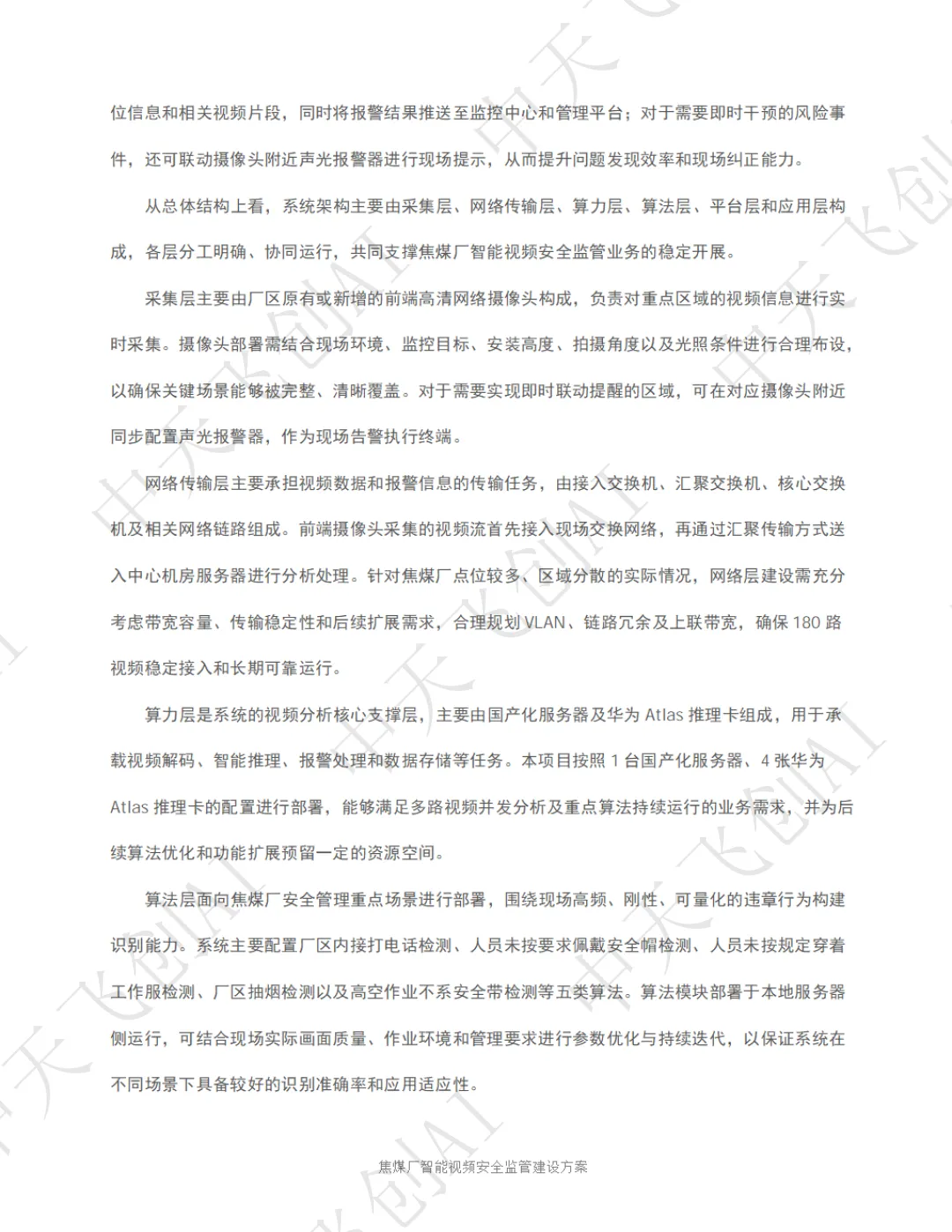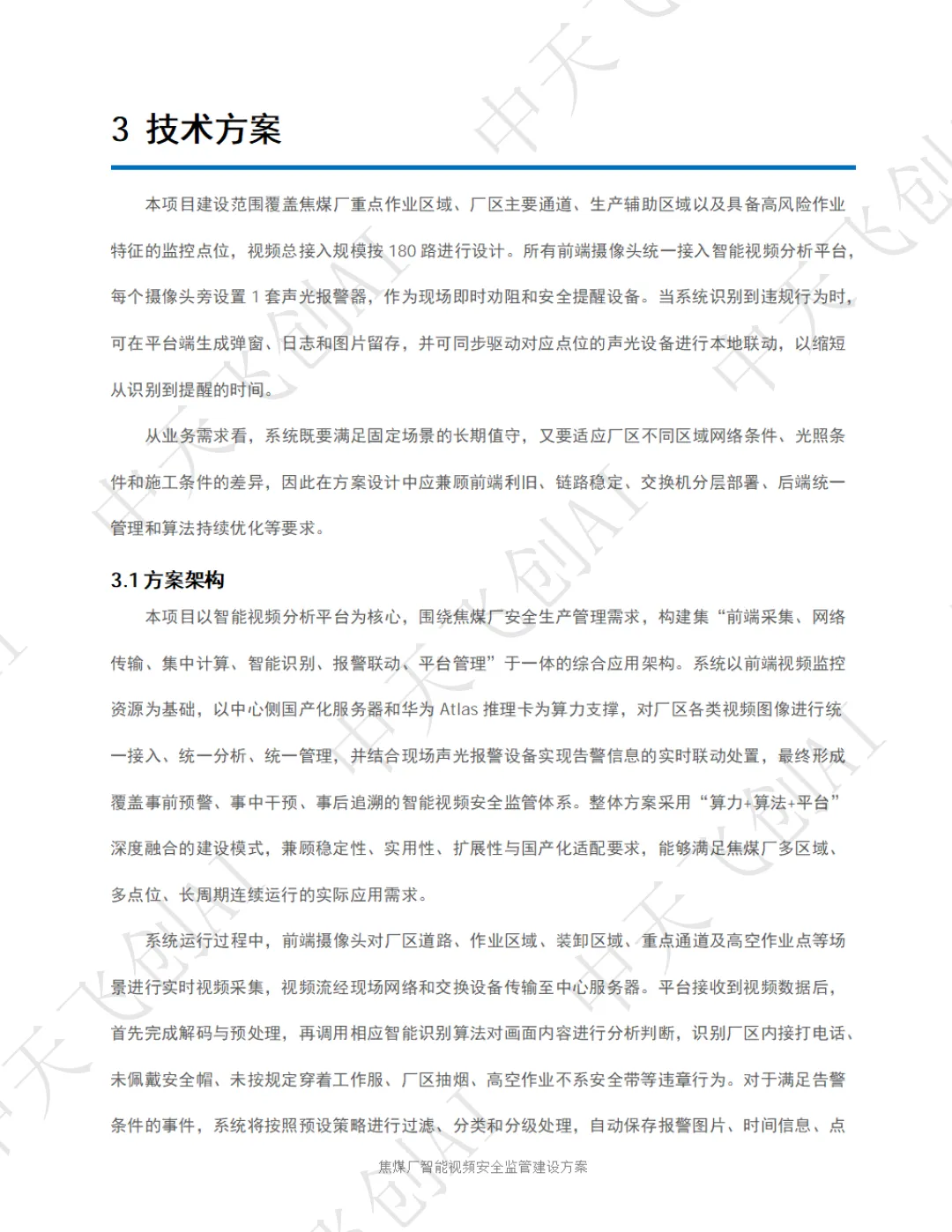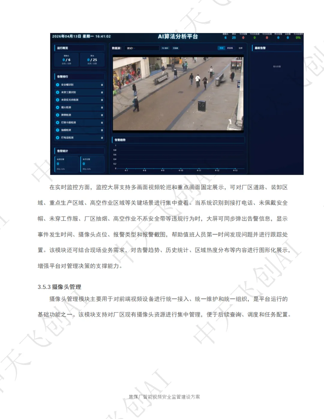 面对这一行业痛点,陕西中天飞创信息技术有限公司依托自主研发的 AI 视频分析技术与国产化算力平台,推出了化工园区智能视频安全监管整体解决方案。该方案以 "看得见、识得准、联得动、留得下、可追溯" 为核心建设思路,将传统被动式的事后追责,转变为主动式的事前预警和事中干预,为焦煤厂安全生产筑起一道全天候、无死角的智能防线。