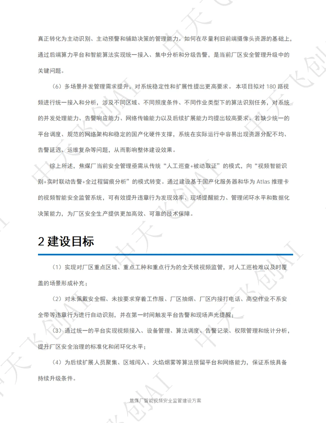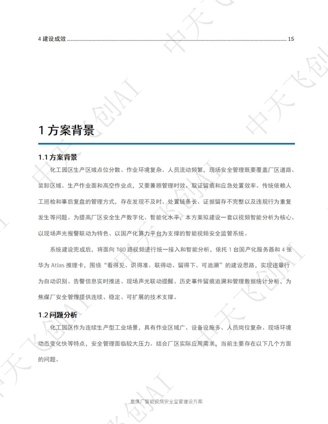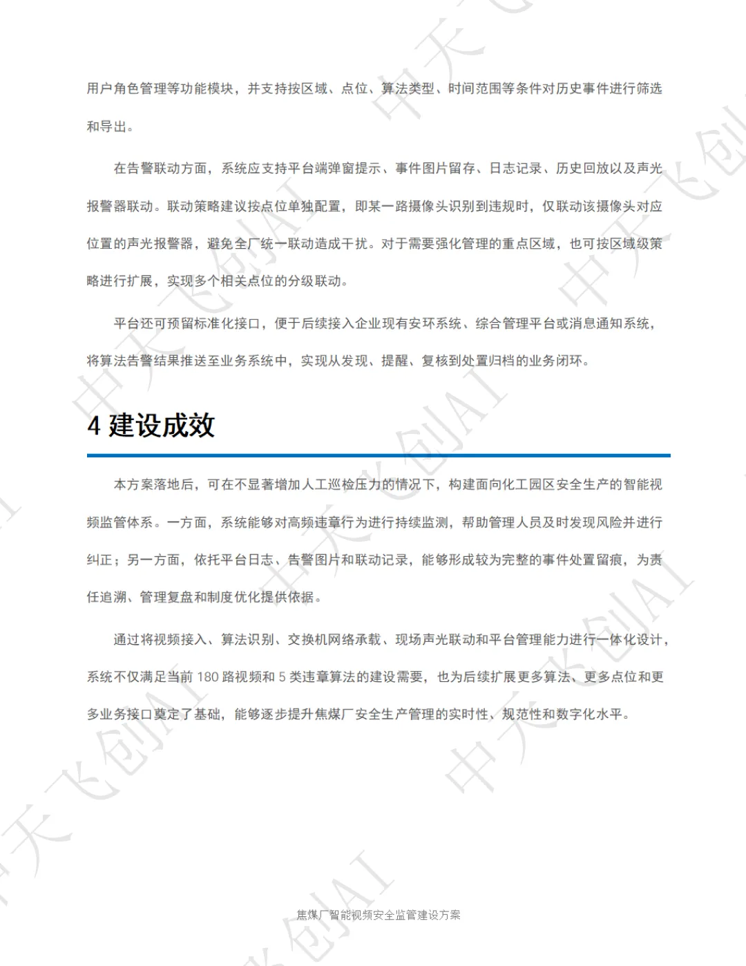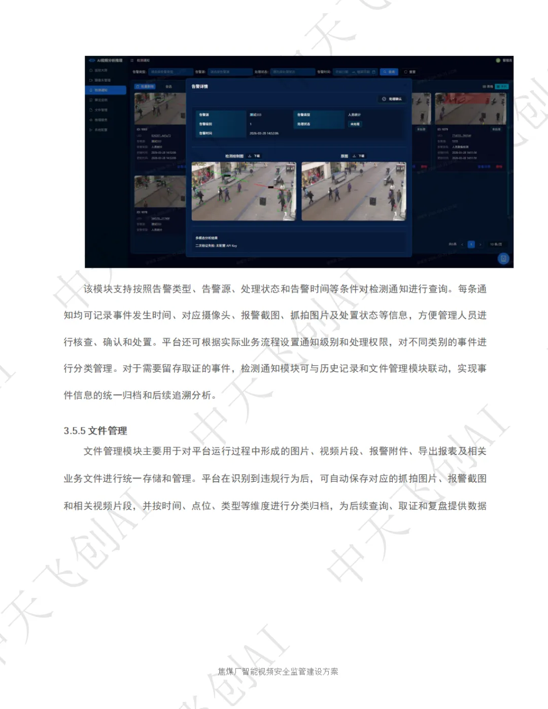面对这一行业痛点,陕西中天飞创信息技术有限公司依托自主研发的 AI 视频分析技术与国产化算力平台,推出了化工园区智能视频安全监管整体解决方案。该方案以 "看得见、识得准、联得动、留得下、可追溯" 为核心建设思路,将传统被动式的事后追责,转变为主动式的事前预警和事中干预,为焦煤厂安全生产筑起一道全天候、无死角的智能防线。