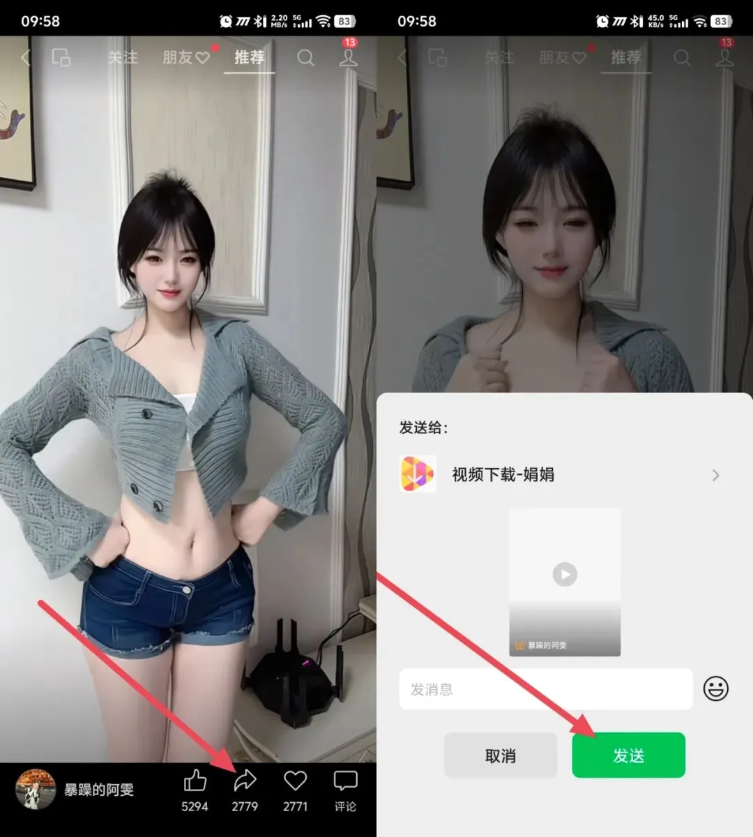 ① ➡️ 进入视频号,找到心仪的视频,点击【转发】按钮,选择【转发给朋友】,将视频发送给“视频下载机器人”。