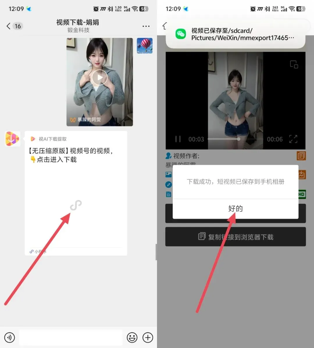 ② ➡️ 视频下载机器人会自动解析视频,并返回一个下载小程序链接;进入小程序,就可以一键下载视频到手机相册啦!