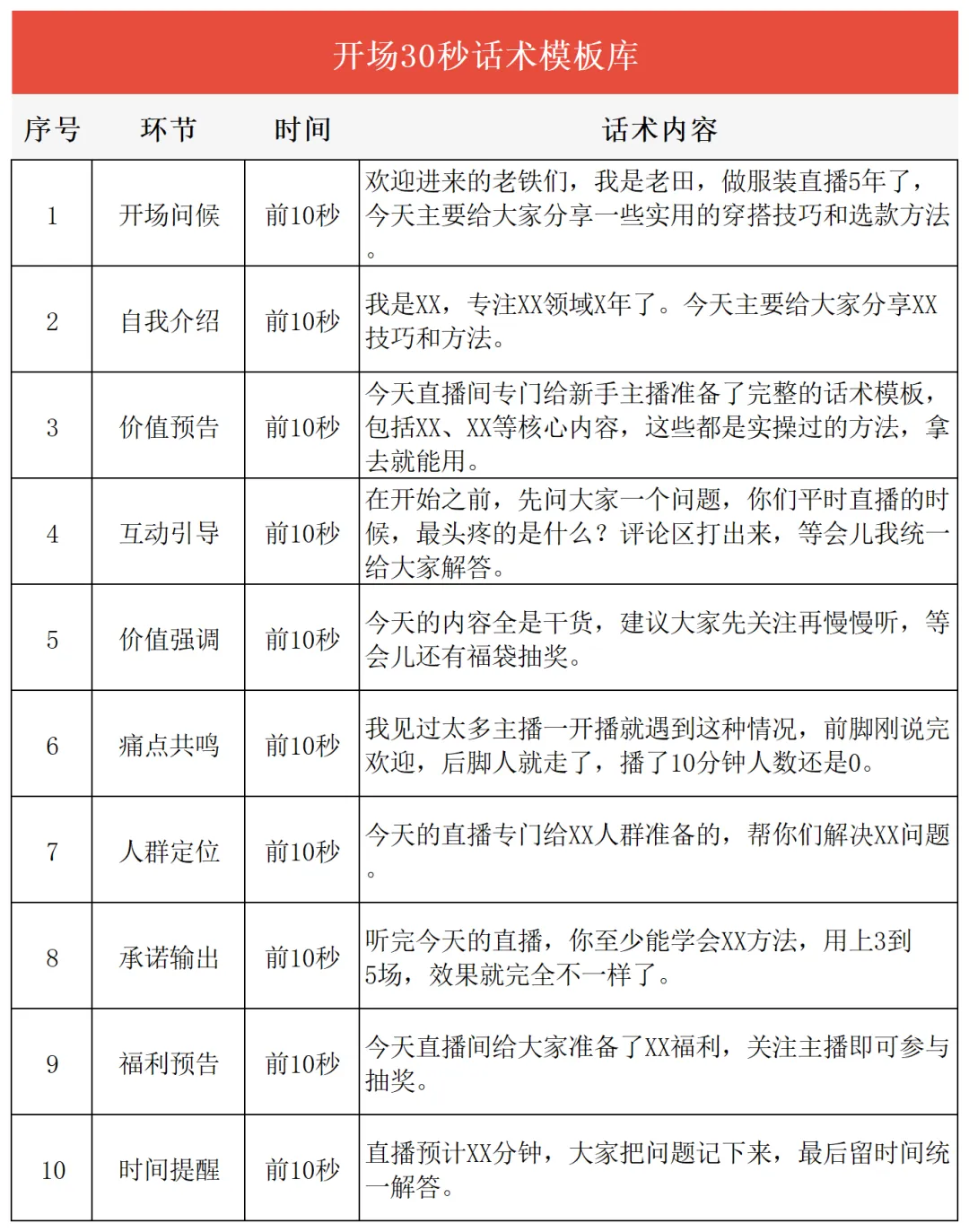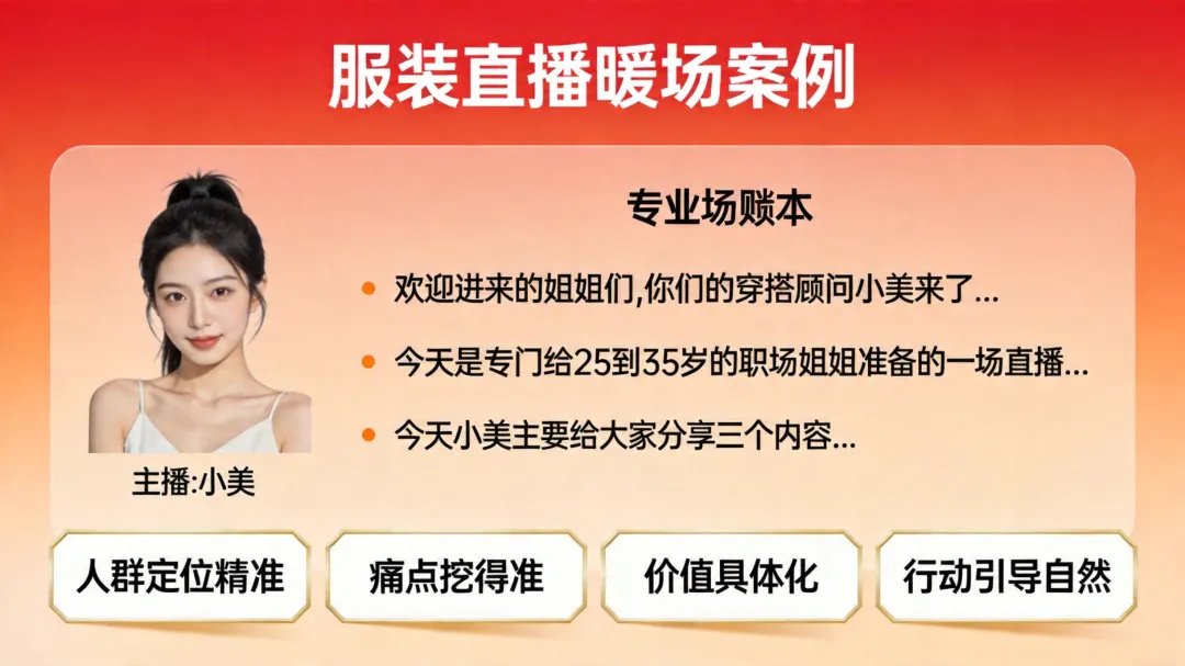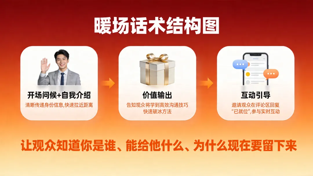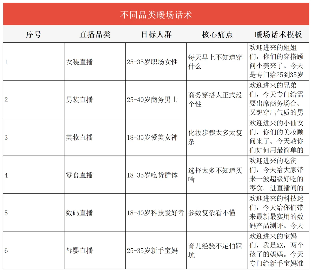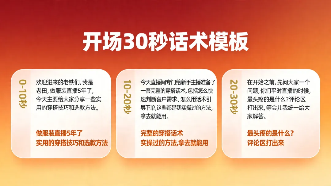 直播暖场话术怎么讲?30秒留人模板让观众主动留下来你有没有这种感觉:直播间开了,灯打好了,话术也背了,结果进来的观众刷一下就走了?说实话,我见过太多主播一开播就遇到这种情况。前脚刚说完"欢迎来到直播间",后脚人就走了。播了10分钟,在线人数还是个位数,心态直接崩了。你可能觉得是自己的产品不够好,或者价格不够便宜。但真相是什么?我告诉你,90%的情况下,问题就出在你开播前30秒。今天老田给你分享一套我亲测好用的暖场话术模板,学会了这套话术,你直播间的前30秒留人率至少提升3倍。先搞明白:为什么观众30秒就划走你先搞清楚一件事:观众划走你直播间,不是你的问题,是你的开场没有给他留下来的理由。我做直播这么久,观察下来一个规律,前3秒是视觉吸引,你画面够不够吸引人;前10秒是价值感知,观众能不能快速判断这个直播间对他有没有用;前30秒是信任建立,观众能不能相信你这个主播是个靠谱的人。任何一个优秀的主播,都是在这30秒里把三件事做到位了。你要是没做到位,观众就会觉得这个直播间不值得停留,直接划走。一般来说,观众划走你的直播间,主要有三个原因。有的人开了直播间就开始推产品,连自己是干什么的都没说清楚。观众进来了,一脸懵,不知道这个直播间能给自己带来什么价值。还有的主播,开播第一句话就是"今天给大家介绍一款特别好用的产品",结果产品介绍完了,观众还是不知道好在哪儿、跟自己有什么关系。再有一种情况,直播间冷冷清清的,主播自己都不知道该说什么,观众进来一看这氛围,直接就划走了。搞清楚这三点,你就知道暖场话术该从哪里入手了。30秒暖场话术模板:抓住黄金留人期好了,说了这么多,你肯定要问了:暖场话术到底怎么讲?我给你拆解一套30秒暖场话术模板,这套模板我用了大半年,效果一直很好。你记住一个原则:30秒之内,必须让观众知道你是谁、能给他什么、为什么现在要留下来。先说开场问候加自我身份介绍(前10秒)。开播之后,你别急着介绍产品,先做一个简单的自我介绍。我建议你这样说:"欢迎进来的老铁们,我是老田,做服装直播5年了,今天主要给大家分享一些实用的穿搭技巧和选款方法。"你发现了没有,这句话里面有几个关键信息。首先是你的名字,让观众记住你。其次是你的专业领域,"做服装直播5年",这句话在告诉观众我是专业的,你跟着我学没问题。最后是价值预告,"穿搭技巧和选款方法",让观众知道自己能得到什么。再说价值输出,让他知道留下来能学到什么(前10秒)。做完自我介绍之后,你紧接着要说清楚今天直播的价值。我建议你这样说:"今天直播间专门给新手主播准备了一套完整的穿搭话术,包括怎么快速判断客户需求、怎么用话术引导下单,这些都是我实操过的方法,拿去就能用。"这句话一出口,效果就不一样了。你划定了人群,"新手主播"这几个字让进来的观众一下子有了身份认同感,觉得你是在讲给自己听。同时你给出了具体价值,"穿搭话术"、"判断客户需求"、"引导下单",这些词让观众知道留下来能得到什么。最后是互动引导,让他现在就参与进来(前10秒)。说完价值之后,你最后要给观众一个留下来的理由。我建议你这样说:"在开始之前,先问大家一个问题,你们平时直播的时候,最头疼的是什么?评论区打出来,等会儿我统一给大家解答。"你想想,这个问题一抛出去,效果就不一样了。首先你给了观众互动理由,"评论区打出来",让观众有事可做。其次你给了承诺,"统一解答",让观众觉得现在走了就亏了。最后你制造了期待感,让观众想看看你到底能解答什么。只要这30秒你做到位了,大部分观众都会愿意多待一会儿。你要做的就是趁热打铁,进入下一个环节。服装直播间暖场话术案例拆解说完了通用模板,我给你拆解一个具体的服装直播案例,让你感受一下这套话术在实际场景中怎么用。我见过一个做女装直播的主播,她是这样开场的。"欢迎进来的姐姐们,你们的穿搭顾问小美来了。今天是专门给25到35岁的职场姐姐准备的一场直播,帮你们解决一个头疼的问题,上班穿什么。我见过太多姐姐每天早上对着衣柜发呆,不知道穿什么出门,结果天天穿那几件,时间长了觉得自己没衣服穿。"你有没有遇到过这种情况,早上起来不知道穿什么,对着衣柜站了10分钟,最后还是穿了那件最保守的黑外套。听到这里,你是不是感觉被戳中了?这就是好的暖场话术的力量。接下来她是这样说的。"今天小美主要给大家分享三个内容。职场穿搭的基本原则,让你每天早上5分钟就能搞定穿搭。还有不同场景的搭配公式,开会、出差、约会都有对应的穿法。另外还会现场试穿,教你们怎么用基础款搭出高级感。姐姐们把关注点起来,等会儿还有福袋抽奖。"你发现了没有,这段话有几个关键点。人群定位精准。"25到35岁的职场姐姐",这句话让进入直播间的观众一下子有了身份认同,觉得这个直播间是专门为自己开的。痛点挖得准。"每天早上对着衣柜发呆"、"天天穿那几件"、"觉得自己没衣服穿",这些场景描述让观众觉得主播懂自己,不是在说废话。价值具体化。"5分钟搞定穿搭"、"不同场景的搭配公式"、"基础款搭出高级感",这些价值点让观众知道自己能得到什么。行动引导自然。"关注点起来"、"福袋抽奖",给了观众留下来的理由。记住一个核心原则暖场话术其实就一个核心原则:让观众在