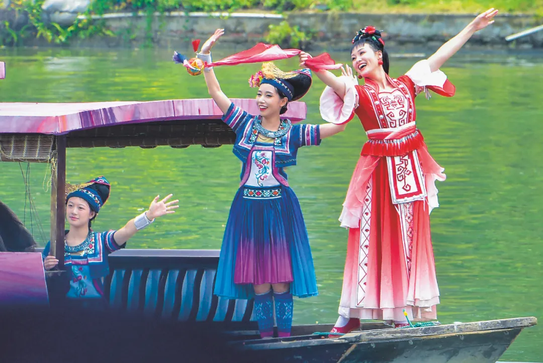 “刘三姐”(右)乘船踏歌迎客。 记者 潘浩 摄