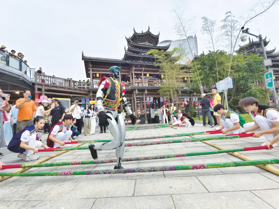 风雨桥头的“人工智能竹竿舞”十分吸睛,机器人卡点精准、进退自如,与群众、嘉宾互动共舞,脚步起落间,科技与传统的边界悄然消融。非遗展示区里,智能民族纹样与绣娘现场织绣同台展示,一针一线间,三江侗绣的千年技艺得到了灵动传承。美食体验区的机器人与真人各展身手,共同演绎打油茶的全过程——捶打、翻炒,动作同步,茶香四溢。
