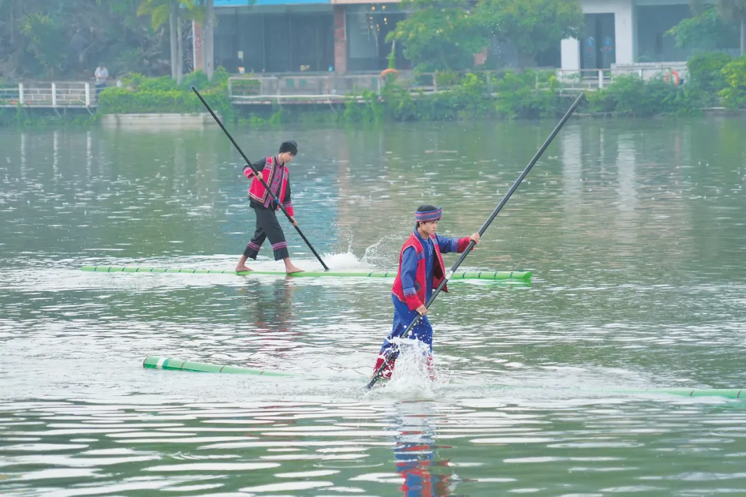 今年开幕式上的民族体育炫表演表现了城市生活的悠闲自在,独竹漂上演惊险与美感并存的“水上轻功”,动力伞编队乘风而来,以整齐的队形在空中翱翔,与远处的桨板太极、水上彩带龙舞遥相呼应,湖面上缓缓升起的热气球,则化作一只“天空之眼”俯瞰整片水域。“今天看了一场水陆空全开的民族体育大秀,水上疾驰、空中飞掠,让人热血沸腾。”游客顾小玉直呼过瘾。