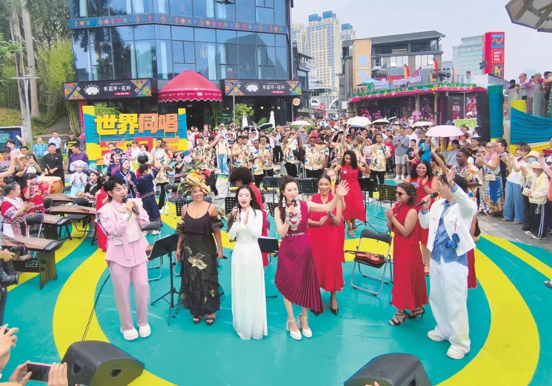 开幕式还上演了一场跨越国界的音乐盛会,精心编排的各国音乐串烧创编秀点燃舞台。巴西里约科帕卡巴纳要塞乐团用热情的桑巴节奏碰撞广西山歌的悠扬韵致;来自越南的江氏梅为观众带来耳熟能详的越南语歌曲《叮叮当当》;马来西亚霹雳州怡保市青少年华乐团联合广西少年共同弹奏经典东南亚民歌;莫离塔上,东盟留学生也加入“三月三”的欢乐海洋。最后,各国歌手与两岸群众共同唱起马来西亚经典民歌《RasaSayange》,欢乐旋律在民歌湖上空飘荡。