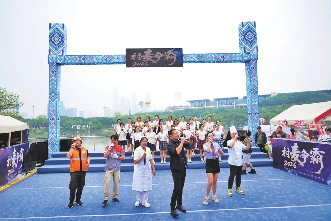 “大海大舞台·村麦争霸”直播推介同步开麦,来自“村麦争霸2026”赛事的部分优秀选手登上了开幕式展演舞台。无论是现场的放声高歌,还是云端的热烈互动,这场“村麦”活动都在用年轻的方式,推动民歌创新性表达。作为2026年“广西三月三·八桂嘉年华”重点活动之一,“村麦争霸2026”旨在填补广西乡村音乐赛事空白,打造现象级乡村音乐IP,为广西民间歌手搭建一个零门槛、全民参与的大舞台。