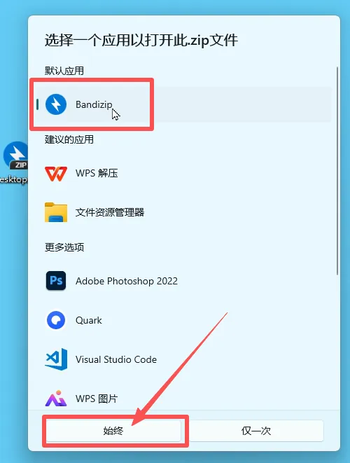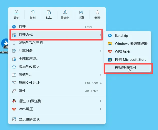 10.最后随便找一个任何格式的压缩包,右击展开打开方式,点击选择娶她应用