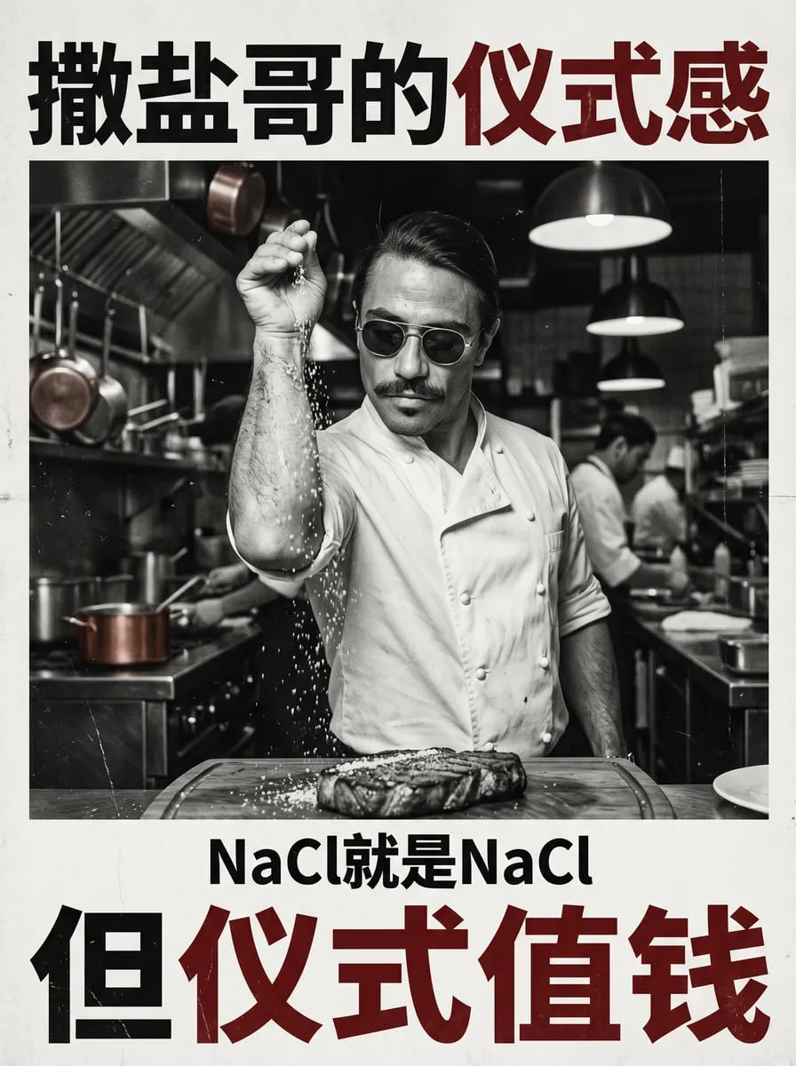 说到仪式感,这里忽然想到了“撒盐哥”……之前也是红极一时,就在你面前给牛排非常有仪式感地撒盐——你说这有啥功能价值,谁撒上去的盐都是一样的咸啊,都是 NaCl 啊。