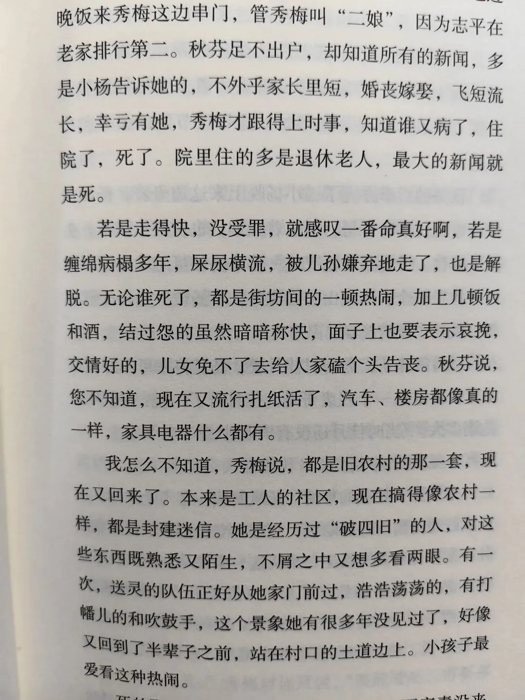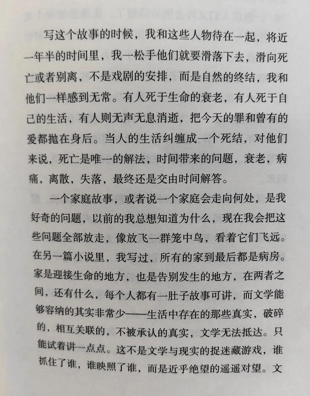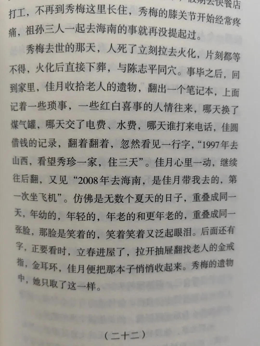 读书笔记|白露春分——家庭的一个模板辽京的《白露春分》,借着一份三代人组成的家庭范本,把流淌的陌生又熟悉的细碎日子记录了下来。秀梅生育了三儿两女,到佳圆、佳月这第三代,成为了独生子女,还能残存一点表兄妹的概念。于是在“计划生育”下,只生一个好,家庭人群走向萎缩。随着成长,独生子女不得不开始独立处理生活中的各种一地鸡毛。在上有老,下有小的情况,在职场无法再像以往般稳定的情况下,如何照顾失去自理能力的老年人,成为难题。无奈又艰难。过往时一堆大人带一个孩子,现在是一个孩子面对一堆老去的生命。婚恋问题不再只是美好的开始,大家开始平衡计较,到底有没有更多精力处理婚姻关系。毕竟看到了家庭之后的各种牵绊,畏难情绪产生,这种情绪积累下悄无声息地吞噬了大家对爱情的向往。秀梅就像无数家庭里的家长一样,能干,把孩子们带大了,又带大了孙辈,儿孙满堂。理论上应该安享晚年。然后呢,晚景看起来却那么狼狈,连体面老去的机会都没有。身体机能渐渐消退,老了好像成为了孩子们的负担,受到了子女的嫌弃,除了两个孙女。佳圆与佳月,就像小精灵一般,懵懂长大了。但秀梅老了,且无法自理。孙女里,佳月好像更孝顺,比子女辈照顾奶奶更多。但是,前男友飞凡跟她说,要分清责任、良心、同情。她也是真的困惑,也没有更多能力放在照顾老人上。三个儿子没养好,都有品行问题,家暴存在三个小家庭,本来秀梅的婚姻也不健康。于是儿媳们各自逃离,每个家庭都离婚收尾。没法像秀梅凑合到,家暴男离世。儿子们生活不如意,事业更是没有,于是都逃避对母亲进行赡养,各种推脱。看吧,故事里,女性困在婚姻沼泽里,眼睁睁看着秀梅她从青春美好变成了最后的麻痹丑陋。男性视角的叙述是没有的,家庭里的男性人数看起来很多,但是就是没深度参与生活。好像生活琐事只是女人的事,于是一个个如花似玉在时间里熬着熬着就凋谢了。男权就是存在于细枝末节处,通情达理的不是没有,但暴力无责确实也存在,只是大家都不承认。就像文中暴躁的祖父即便离开,但还在深深影响着家庭的决策,这种隐形存在,代表父权的权威。秀梅生前无数次表示不愿意和丈夫合葬,最后也被孩子忽视心愿,草草处理了事。看起作为女儿的立秋好像逃开了窒息的圈养,到了上海,她在市场经济还未完全席卷时便丢弃铁饭碗,勇闯大城市,但她在如此环境下长大,也是真的敏感,就是能够判断出外界如何看待自己。她知道家里的男人们,哥哥们看不起她,“哥哥们看不起她,并不是看不起她这个人,而是看不起所有女人,秀梅挨了半辈子打,手被打断过,断着手做家务,他们以为女人不外如此”。她的付出没有赢得家庭男性成员的尊重,只有侄女们的敬爱,和母亲秀梅的认可。但她也做不到更多了,在失去工作机会,也没处宣泄,只能自己想办法。而且,她对于兄弟姐妹的关系还是存在理想化的判断,以为自己拿钱,兄弟们总会对妈妈好一点,却忘了艰难日子里,自顾不暇的男人不可能按照市场规律,处理问题。男人们擅长发怒,觉得自己才是掌控全局的存在。后来,佳圆长大后知道了,那些怒火是屏障,是能力缺失的掩饰。原生家庭使得她到最后也没学会爱,只是擅长凑合,她谁也不爱,也不需要别人爱,能凑合就行,好像避免了爱,就避免了痛苦,日子怎么都能过。可是,日子怎么会跟谁过都一样呢?佳月,更乖巧,孝顺,可是也是被滥用良心,给自己背负起照顾奶奶的责任,但她没有更多能力,也没有更多时间,她还在奋力保持自己的生活。于是她也不会爱,没有更多能量滋养关系,与飞凡的分手在劫难逃。家是孕育未来的地方,是爱情开始的地方,也是告别的地方,“所有家庭到最后都是病房”,每一个家庭都大差不差的运转,过程中发生的故事也都大同小异。最后的最后,去医院照顾病人是绝望的,在知道生命终点即将到来的过程中,是窒息且沉重。“当人在床上,另一个人在床前,就忍不住说出一些言不由衷的话,会好的,没事,别瞎想……”我看到这很难不想到2023年的那两个月,我也是这般对待的病床上的母亲。我确实也困惑,就像辽京在书里写的“为什么至亲的人,到最后不能说些坦诚的话,是不是人一生只有落草的啼哭才是真诚的,其余的语言都是掩饰”。佳圆、佳月不敢对奶奶说,我也不敢跟母亲说,仿佛不说,就能躲过去。辽京,只真实的记录了生活的一种样子,没有评价好与坏。毕竟,即便看起来无比破碎的生活里,也不是一点美好没有。但是最后日子就是无力般坠下去,拦不住,眼睁睁看着无常发生。曾经鲜活的生命,那么热爱生活的女人,终究是变老了,那个爱出门,爱看风景,爱拍照,爱聊天的女人,慢慢沉默。绝望,到最后死亡。当疾病来临,无法得到照顾治疗时,当事人将彻底失去对自己身体的掌控。好无力,好窒息。眼睛不行,耳朵不行,腿脚不行,每一个症状都一点点吞噬人的自尊心。孩子们大了,家长陪不到最后,各凭本事造化吧。我选择听天由命。家庭里人与人之间,夫妻关系,母女关系,母子关系,婆媳关系等等,充斥着很多不理解,到生命的最后阶段也不能全部调和掉。只能放在那,随着时间赶着走。成长中逃不开困惑、衰老、离散以及生死离别,时间自顾自的流淌,平等的冲刷每一个曾经来过的生命。每一个家庭都要面对自己的课题。爱是真的,恨也是真的。不能较真,且说不