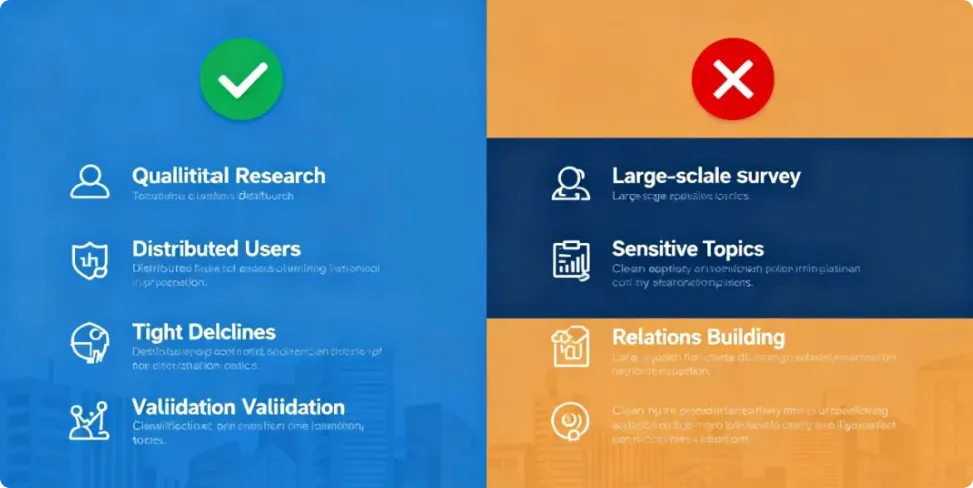 AI 访谈适合深度的定性研究,不适合大规模的定量验证。想用 AI 访谈做「 1000 个用户的满意度调研」?走错片场了。这种场景,用问卷工具更合适。