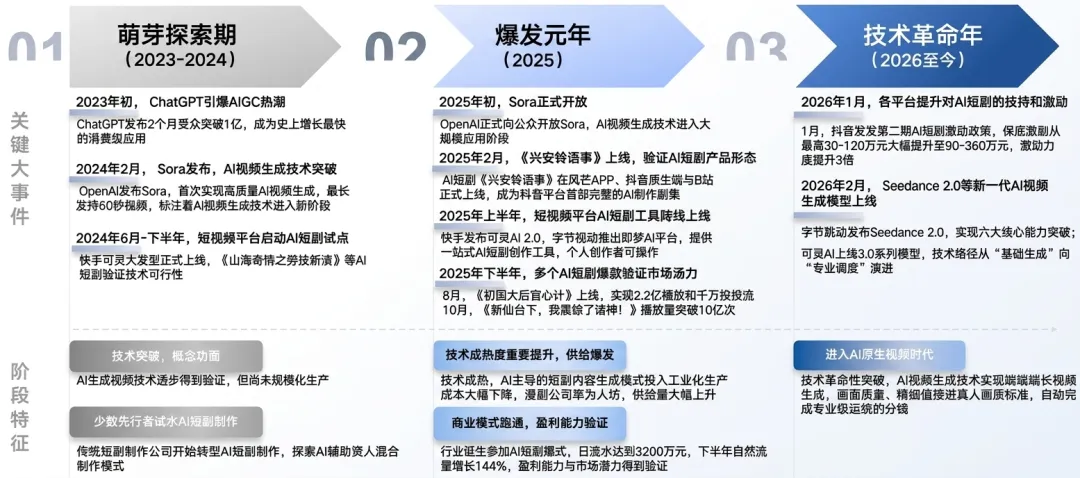 “本文基于《明略科技2026中国AI短剧行业发展与受众洞察报告》,详细梳理了AI短剧行业从2023年至2026年的演进历程,将其划分为萌芽探索、爆发元年与技术革命三个关键阶段。