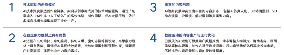 “AI短剧定义:以生成式AI为核心驱动力,通过算法系统实现剧本创作、角色生成、场景 AI短剧 构建、音频合成、智能剪辑等流程辅助或自主创作;单集时长从几十秒到20分钟、 有着相对明确的主题和主线、较为连续和完整故事情节的网络影视作品形态。