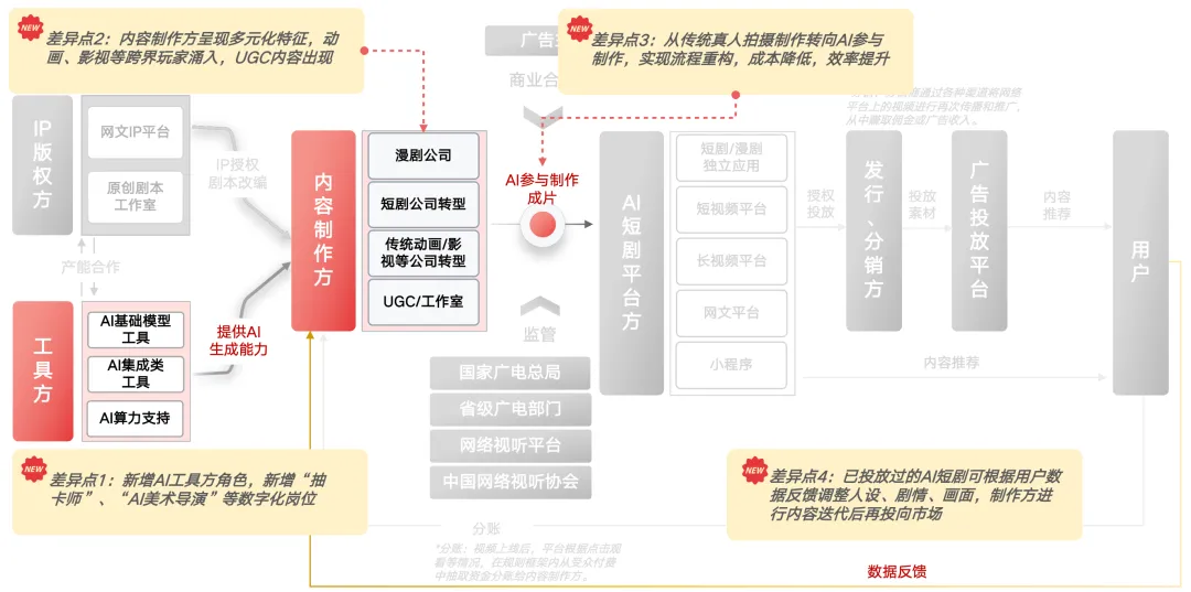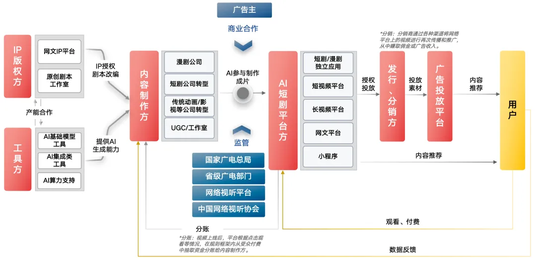 用“IP—制作—技术—分发”来概括这一闭环结构:IP版权方授权与改编,工具方提供模型与算力,内容制作方完成成片,平台承担分发与分账,用户侧观看付费反向驱动迭代。