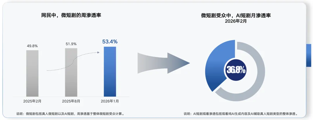 先看“渗透”。在线调研显示,微短剧在网民中的周渗透率在2026年1月达到53.4%,而在微短剧受众中,AI短剧的月渗透率达到36.8%,意味着AI短剧已经进入微短剧消费习惯的核心圈层。 同时,行业播放规模也呈现“快速增长并具备爆发弹性”的特征:行业监测数据显示,2026年1月AI短剧播放量为49.7亿,环比增长接近2倍;在2025年6—12月的增长曲线中,月复合增长率约12%。
