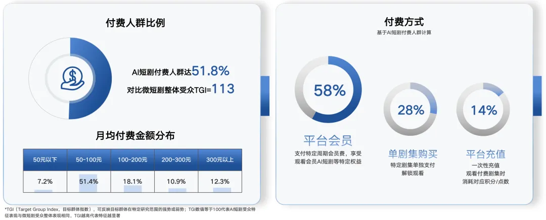 付费意愿是AI短剧商业化最关键的信号之一。AI短剧付费人群占比达51.8%,并显著高于微短剧整体水平;付费方式以平台会员为主(约58%),其次是单剧集购买(约28%)与平台充值(约14%);月均付费金额集中在50—100元区间(约51.4%)。 在“为什么付费”的动机上,用户最看重“完整观看”与“抢先观看”,同时会因为“价格低/性价比高”“支持创作”以及“解锁多结局”等机制付费。