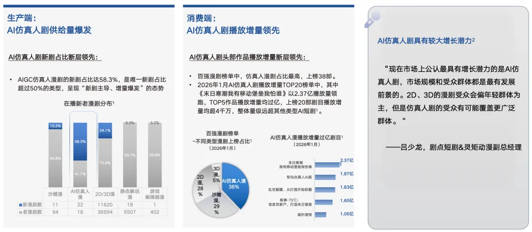 第二条趋势是AI仿真人内容的增量潜力正在释放。在生产端,AI仿真人漫剧新剧占比达到58.3%,呈现“新剧主导、增量爆发”的态势;在消费端,AI仿真人作品的播放增量也更领先,并被行业受访者认为有望覆盖更广泛人群。 这意味着,AI短剧可能出现一条“从二次元漫剧→更强拟真→更大众化题材”的升级路径:当拟真度与情感表达能力补齐,AI短剧在都市、悬疑、情感等更大众的题材带宽上会被进一步打开。