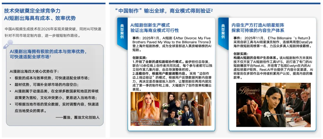 02 爆发元年出现在2025年:标志不只是作品数量上升,更重要是爆款与变现闭环出现,让“能赚钱”成为行业共识。将这一年称为“AI短剧元年”,并以《兴安岭诡事》、《奶团太后宫心计》等为代表,指出从内容制作到商业化路径逐步跑通,供给端出现数量级上升与平台专项入口的成形。