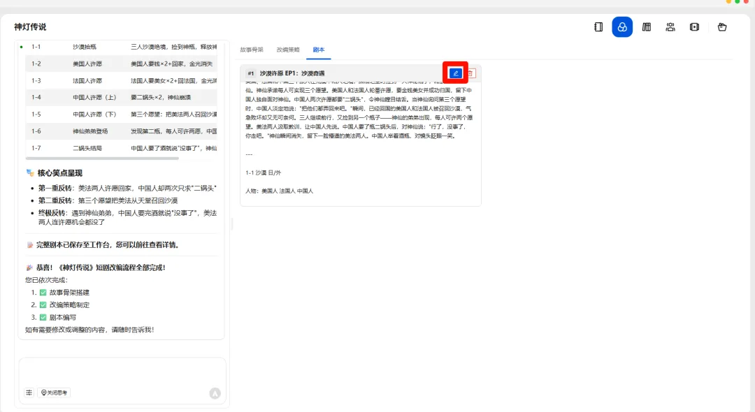 自动化剧本生成:将选定章节或事件,自动转化为包含对白、场景描述的结构化剧本。