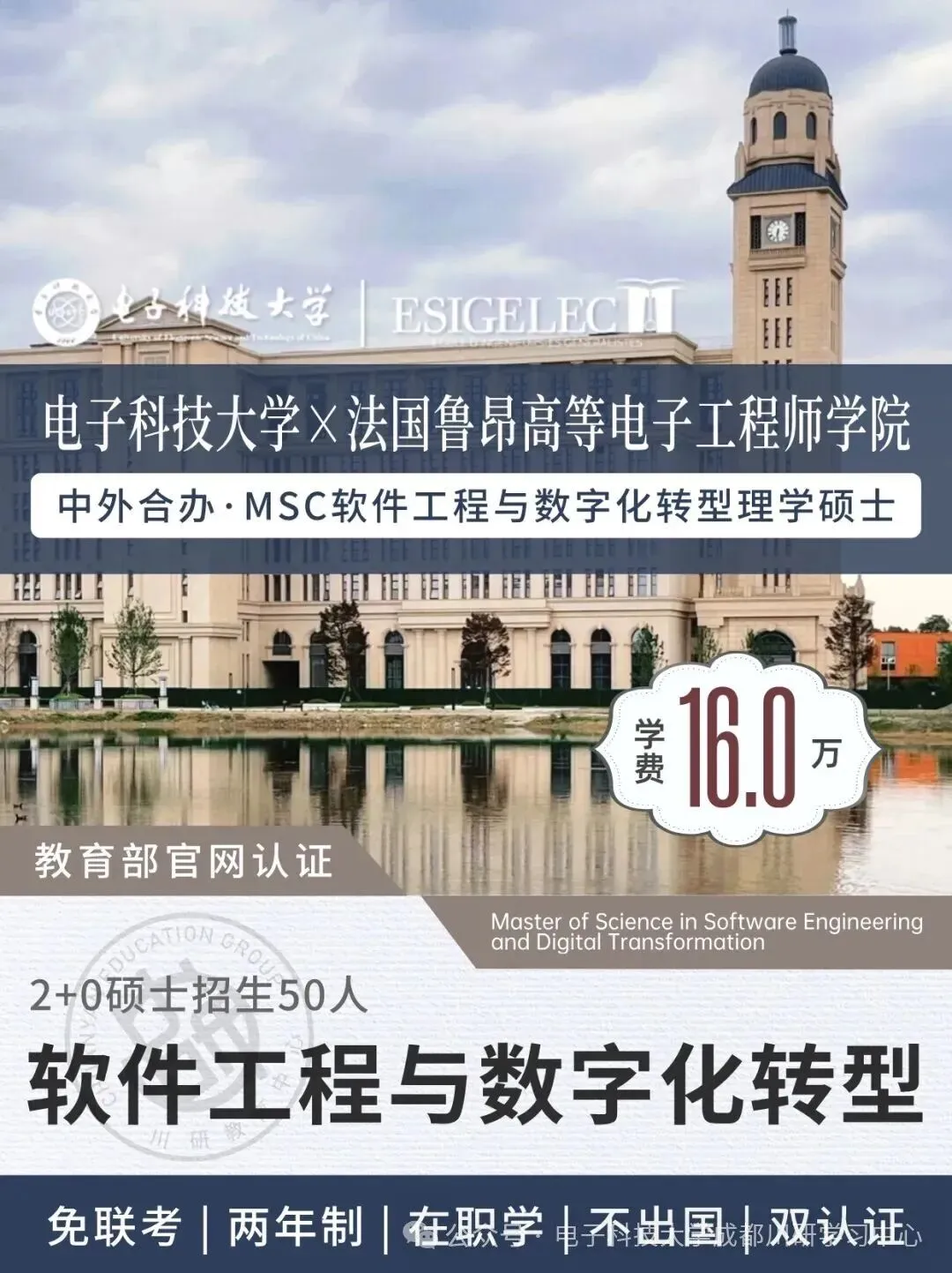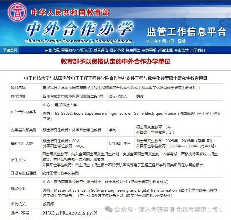 电子科技大学与法国高等电子工程工程师学院合作举办的软件工程与数字化转型专业理学硕士教育项目是经教育部正式批准的中外合作办学项目,由电子科技大学信息与软件工程学院负责具体实施。