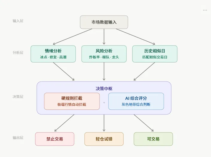 数据进来之后,先由不同模块分别分析情绪、风险和历史相似度;再由一个统一的决策中枢汇总结果,输出策略建议——禁止交易、轻仓试错,还是可以交易。