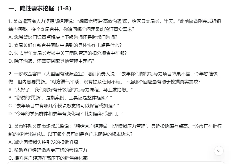3. 把第13、15、19、20题抄下来,每周看一遍这几道题涉及的场景,AI说“频繁出现在真实政企大单中”。我打算把它们当成镜子,每次见客户前对照一次。