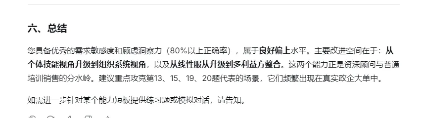 “您具备优秀的需求敏感度和顾虑洞察力(80%以上正确率),属于良好偏上水平。主要改进空间在于:从个体技能视角升级到组织系统视角,以及从线性服从升级到多利益方整合。这两个能力正是资深顾问与普通培训销售的分水岭。建议重点攻克第13、15、19、20题代表的场景,它们频繁出现在真实政企大单中。”
