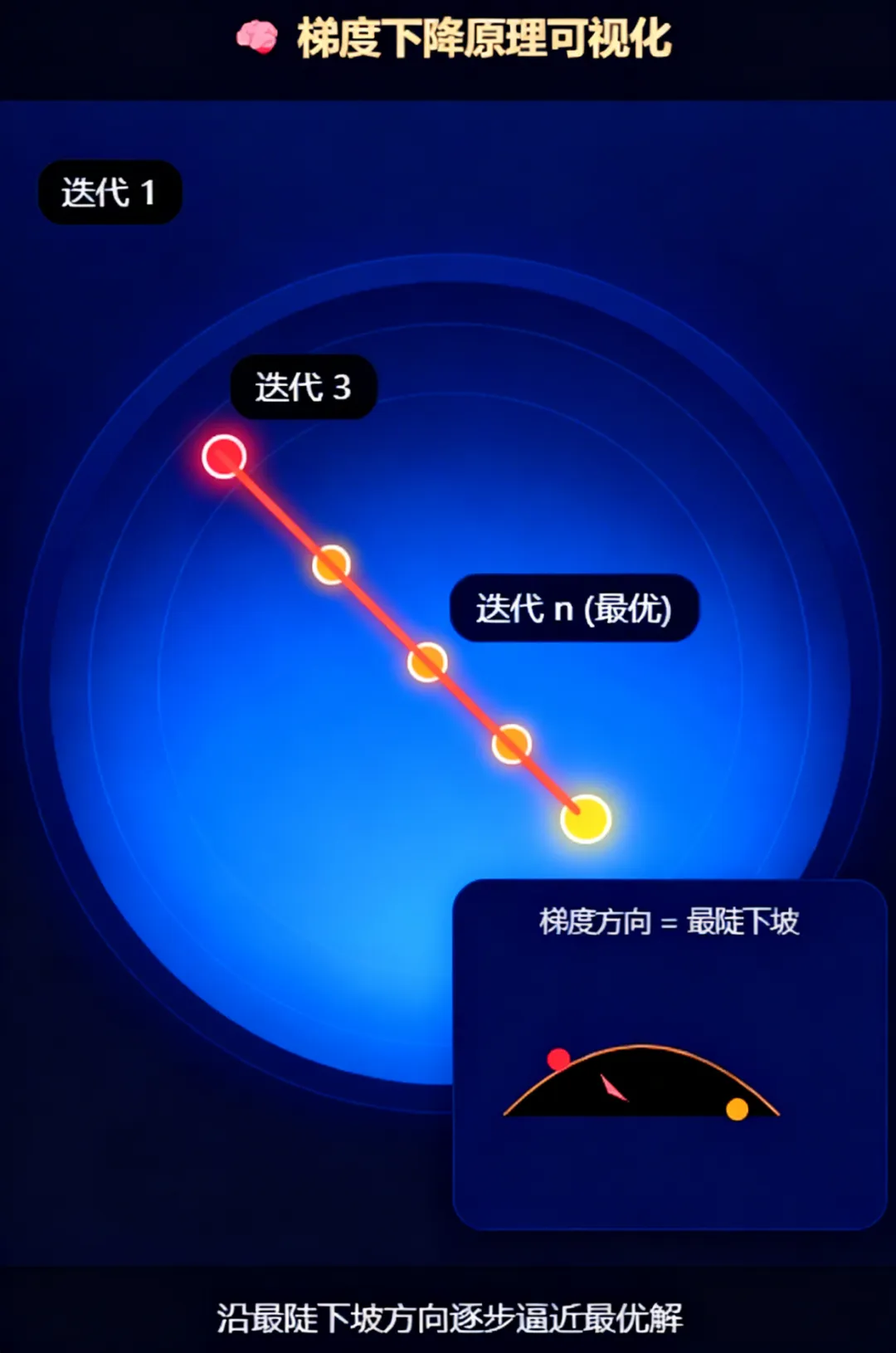 损失值随迭代次数下降,每一步沿负梯度方向更新参数,最终抵达最小值“山脚”。